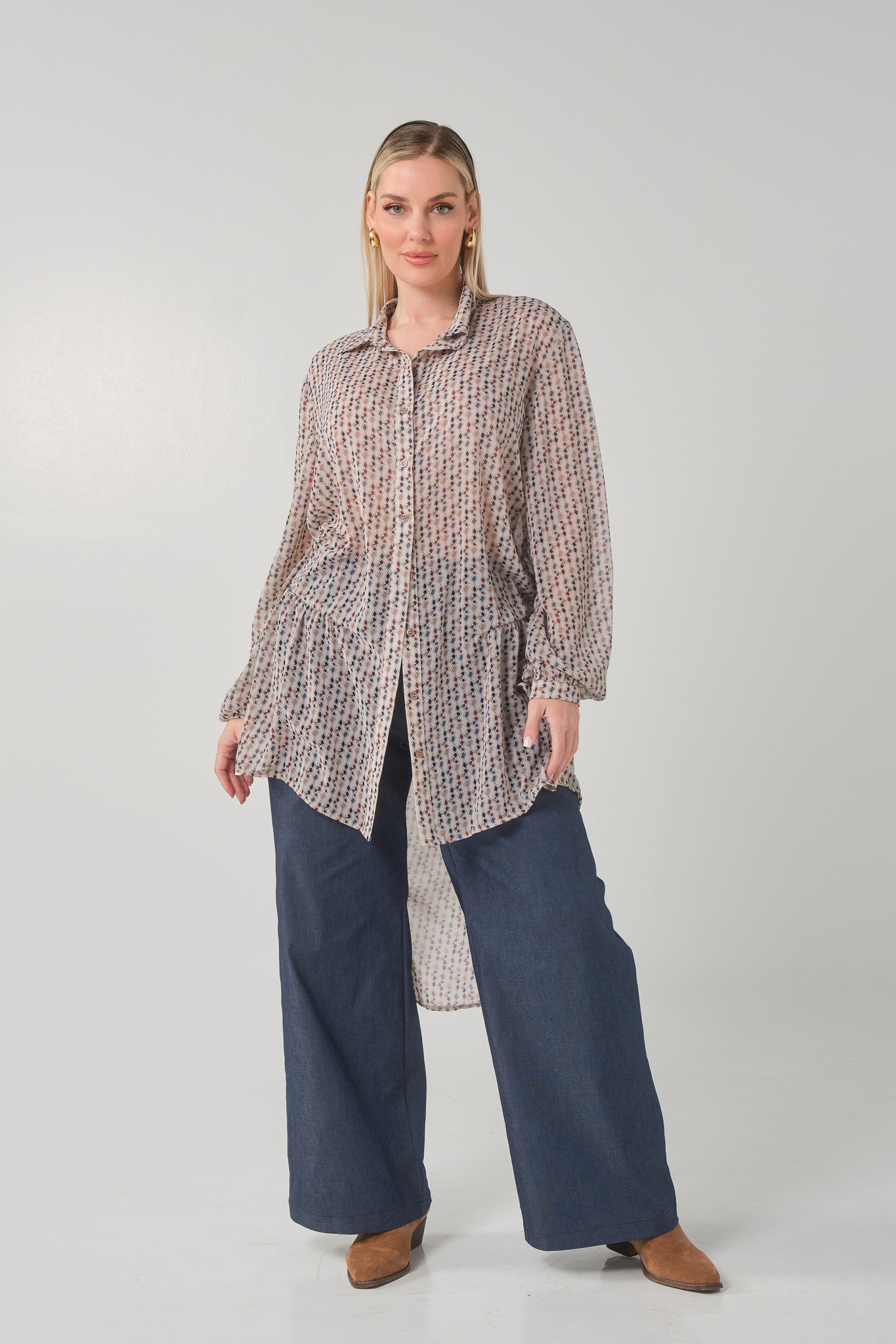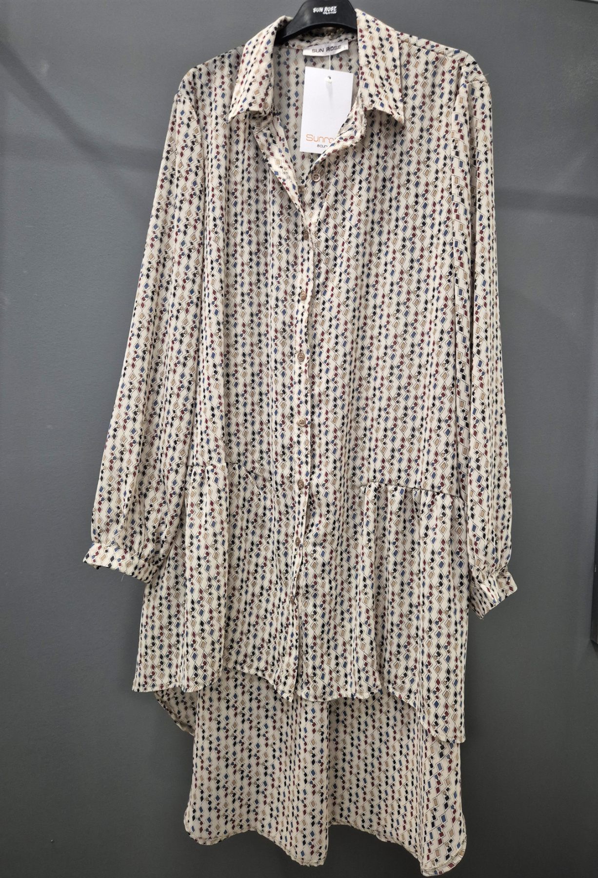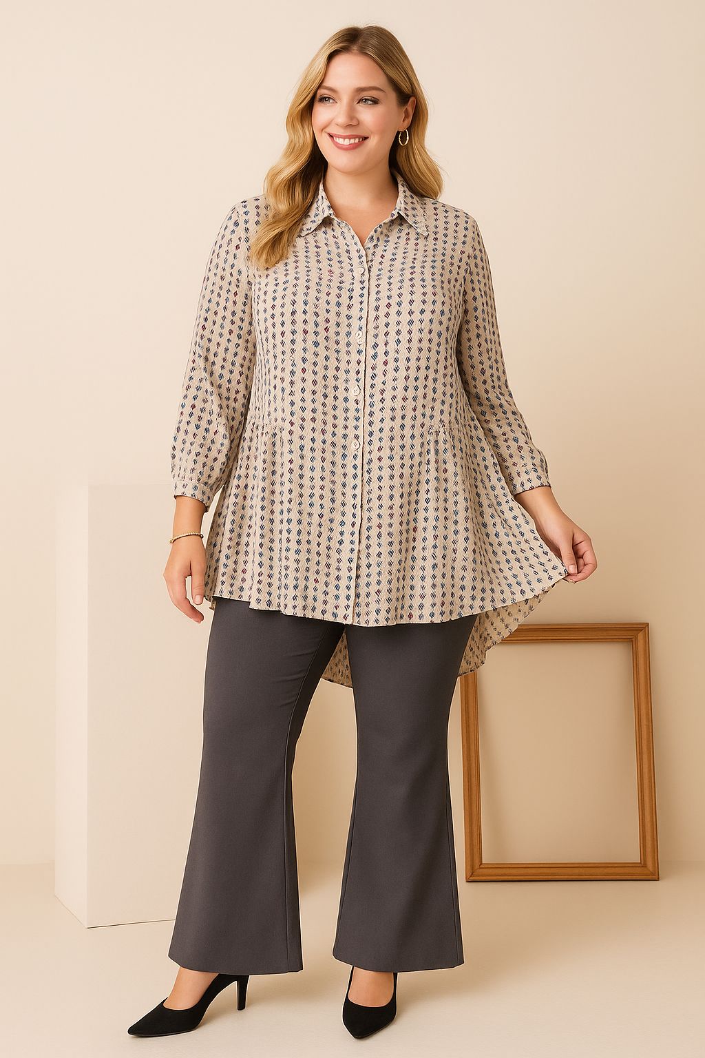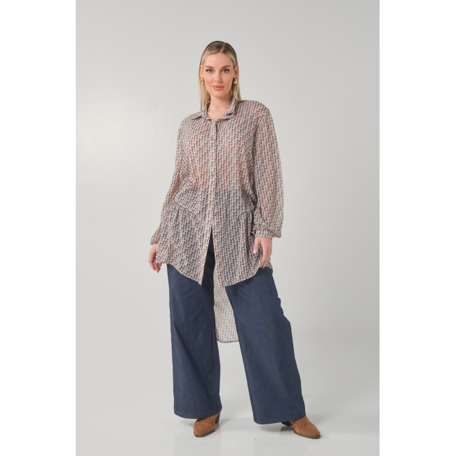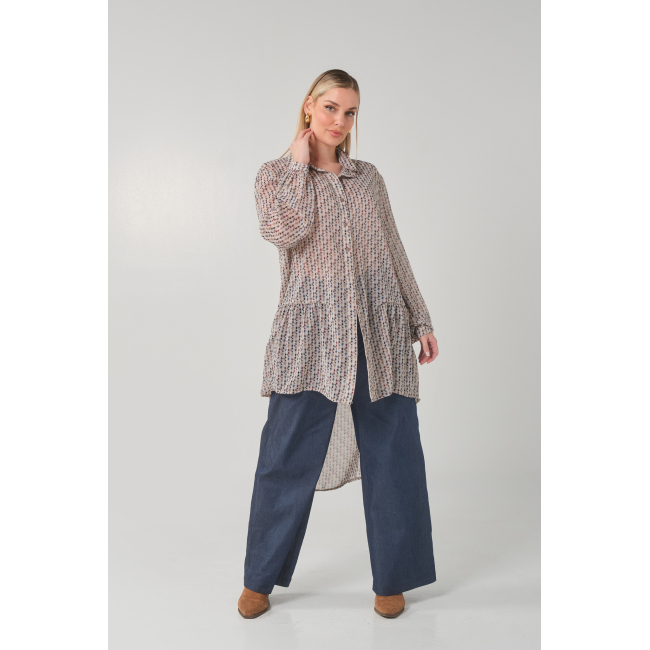 Πουκαμίσα άνιση σε Αδιάφανη εμπριμέ Μουσελίνα, γιακάς πατιλέτα, κουμπιά, μανίκια με μανσέτα και κουμπί, στρογγυλό τελείωμα πίσω, σε πολύ άνετη γραμμή