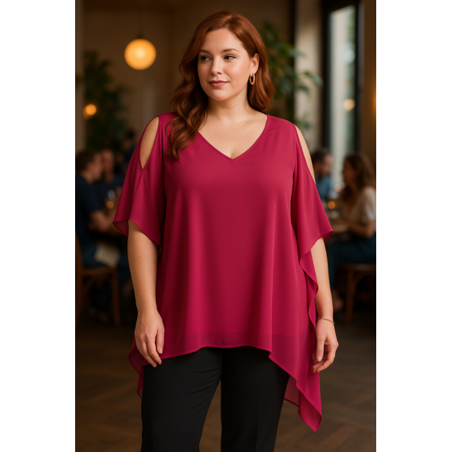 Μπλούζα/Tουνίκ Μουσελίνα, άνοιγμα στους ώμους και τρουακάρ ασύμμετρα μανίκια, σε ίσια πολύ άνετη γραμμή.