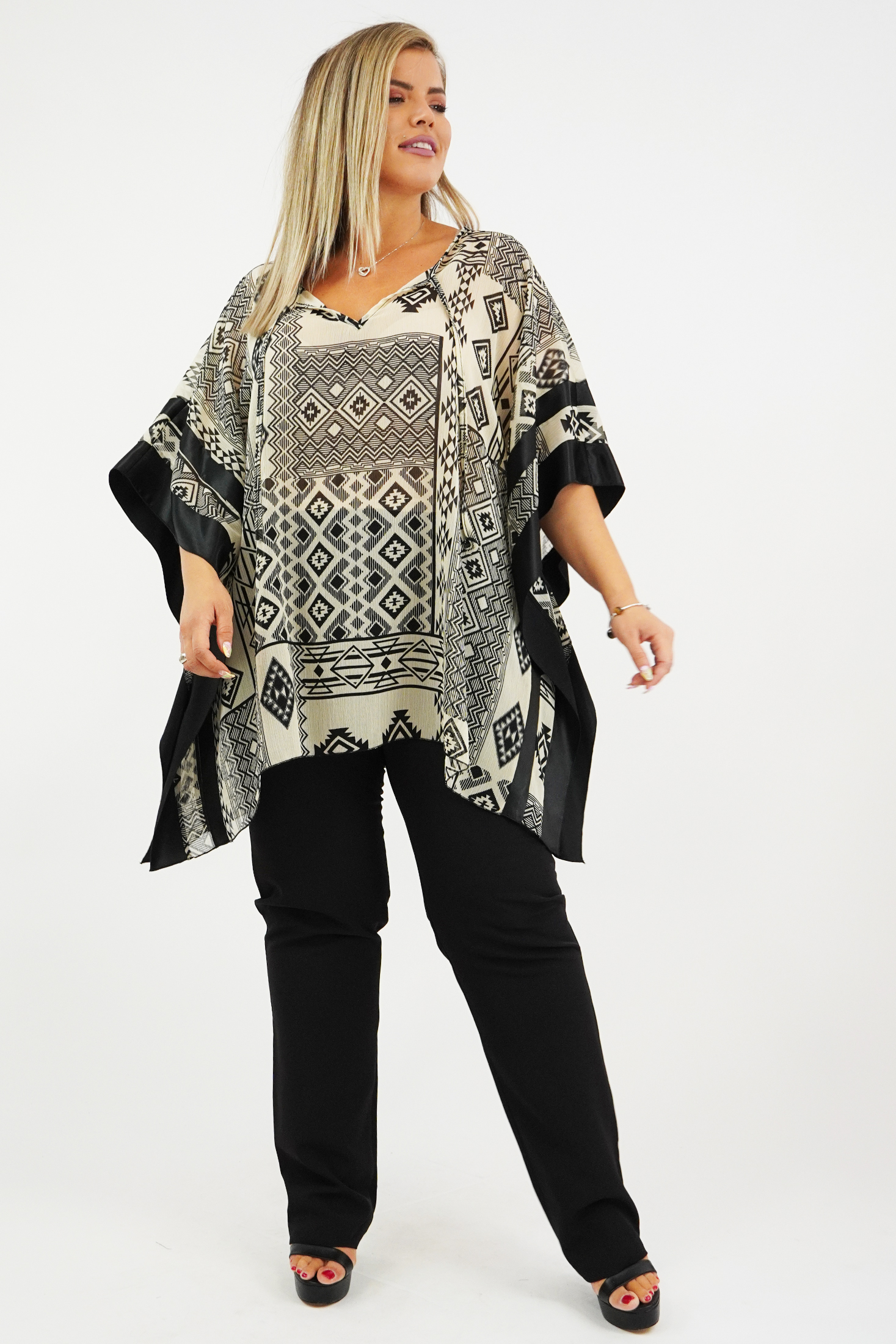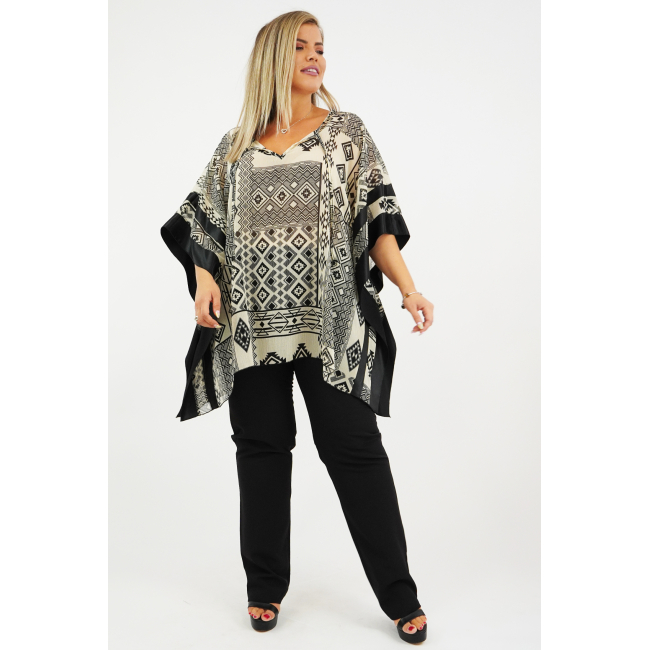 Μπλούζα/Τουνίκ σε αδιάφανη εμπριμέ μουσελίνα, V ντεκολτέ με κορδονάκι για προαιρετικό δέσιμο, σατέν φάσα στα πλαΪνα, σε ίσια πολύ άνετη γραμμή