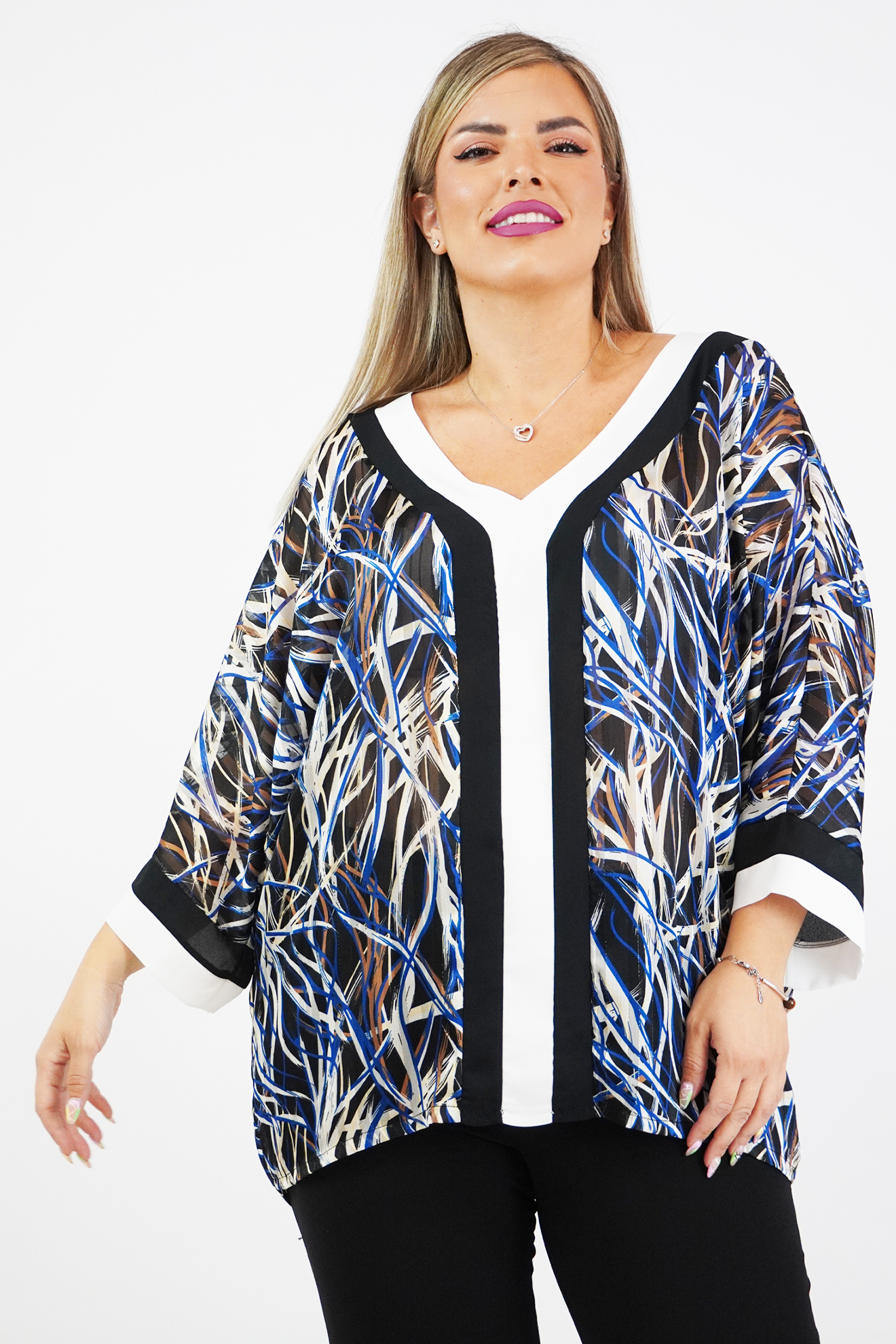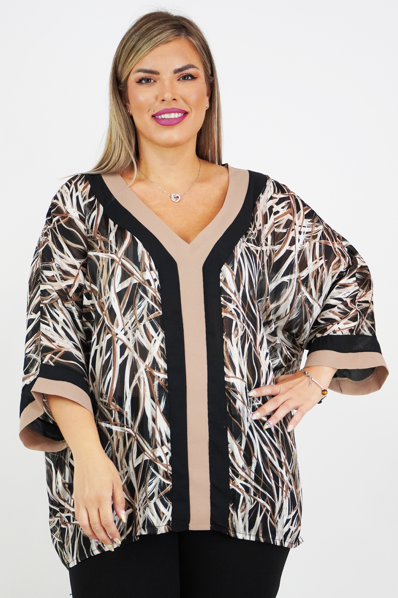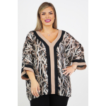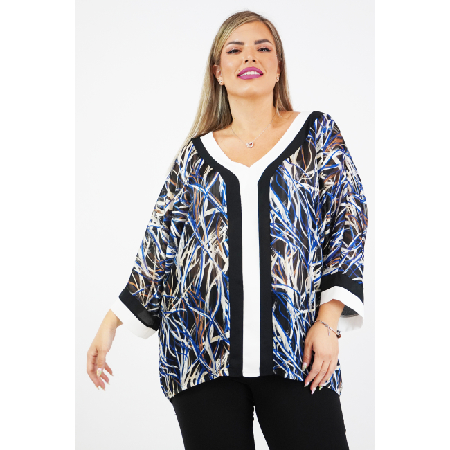 Μπλούζα μουσελίνα εμπριμέ, V ντεκολτέ με δίχρωμη φάσα άλλου υφάσματος, τρουακάρ μανίκια, σε ίσια άνετη γραμμή