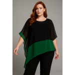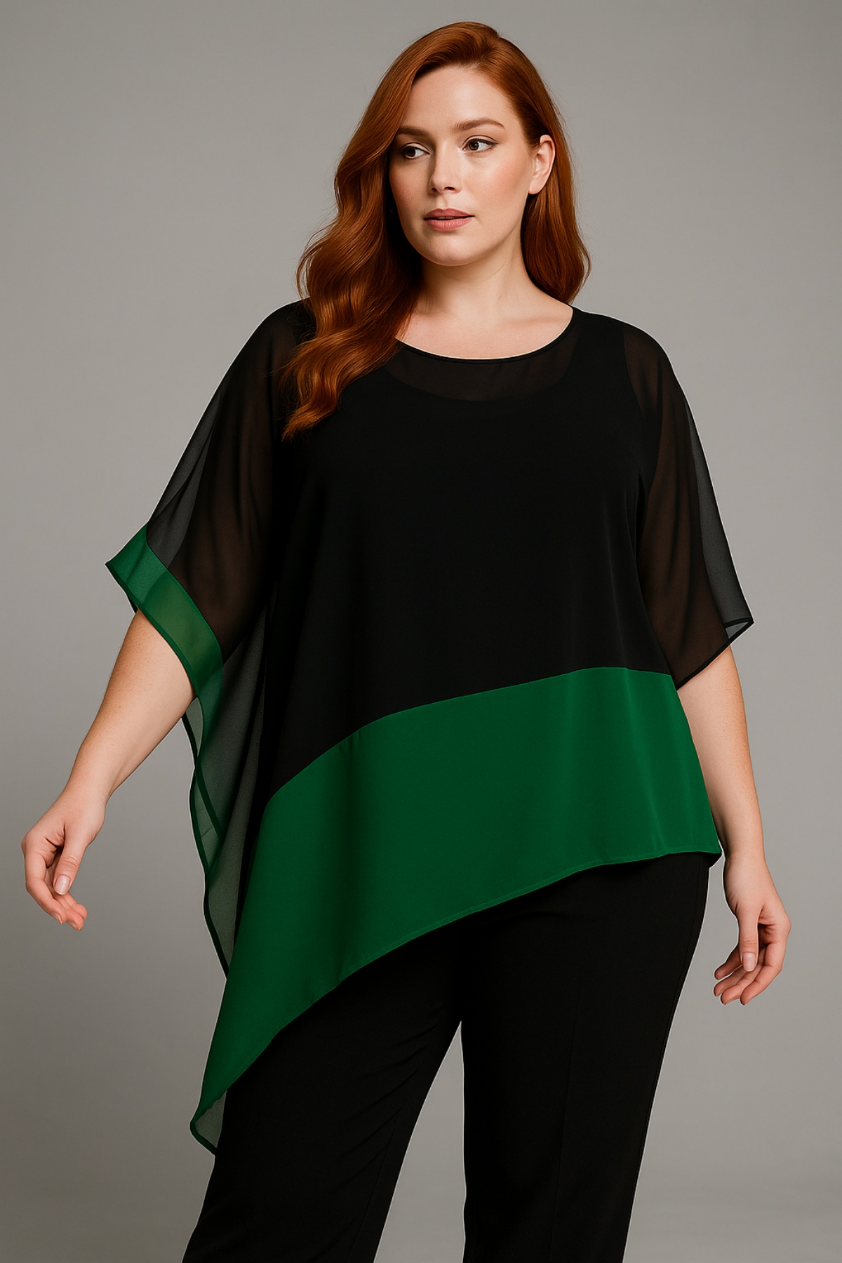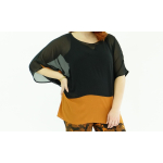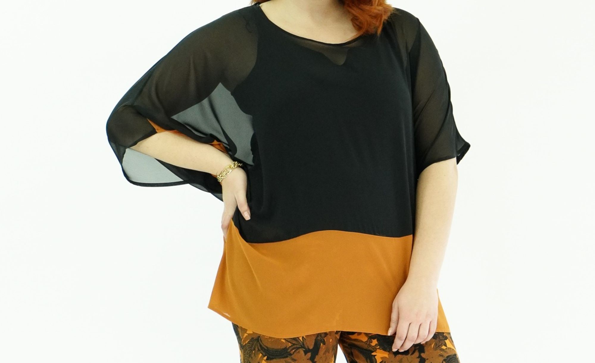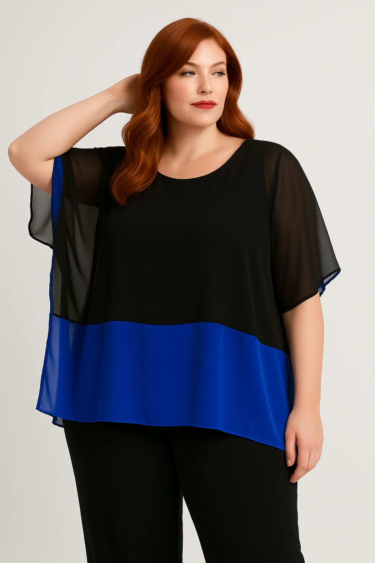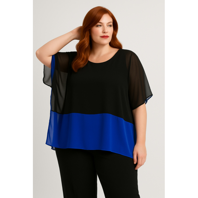 Μπλούζα/Τουνίκ σε μουσελίνα ύφασμα, ελάχιστη διαφάνεια, δίχρωμη, λαιμόκοψη, διαφορετικά μανίκια, πλαισιώνεται με φάσα αντίθετου χρώματος, σε πολύ άνετη γραμμή