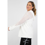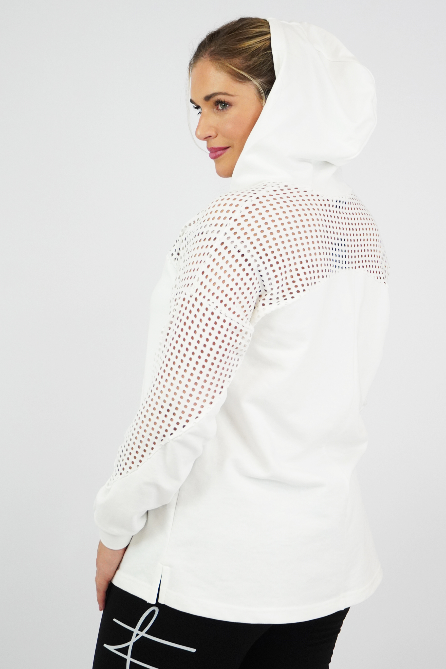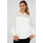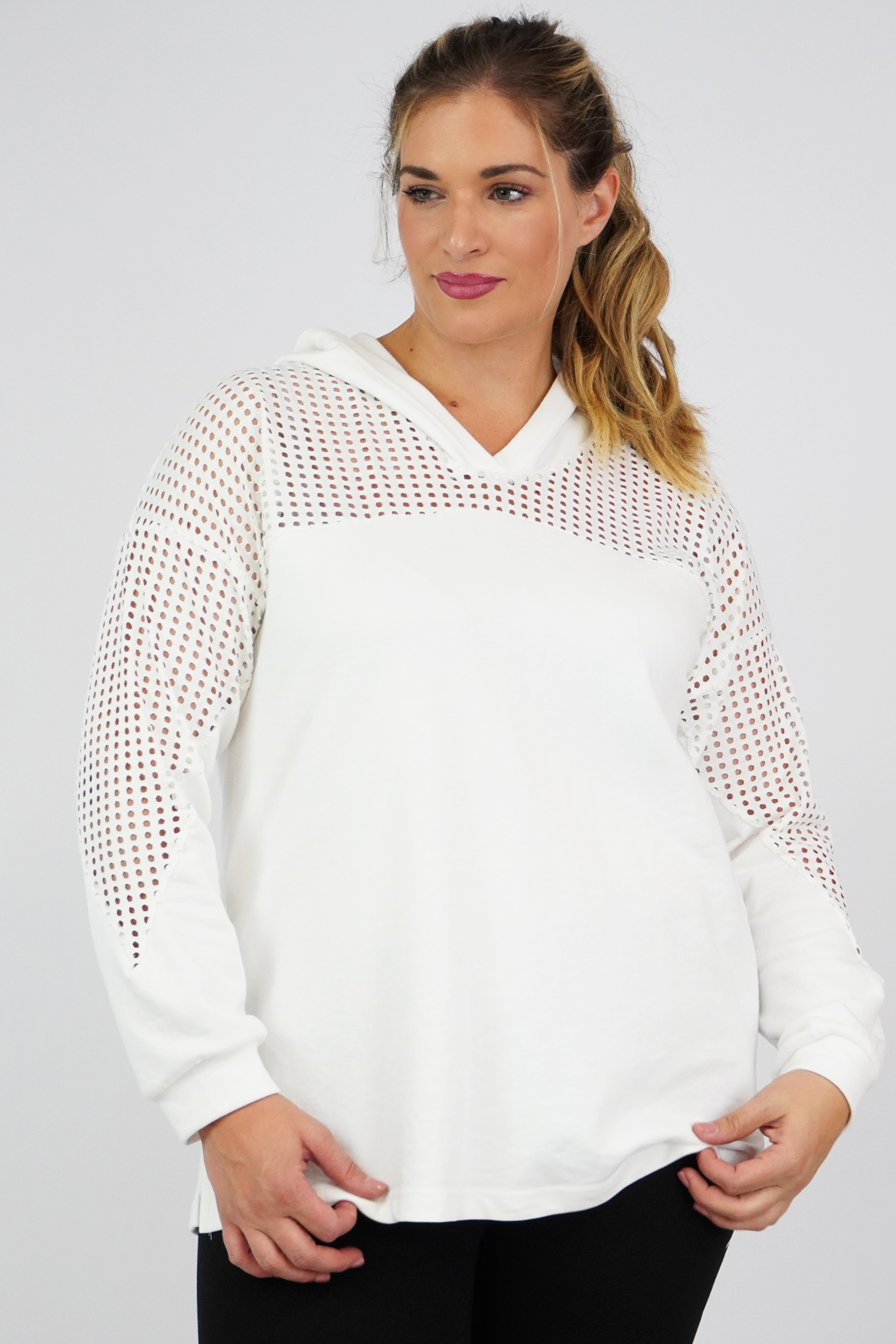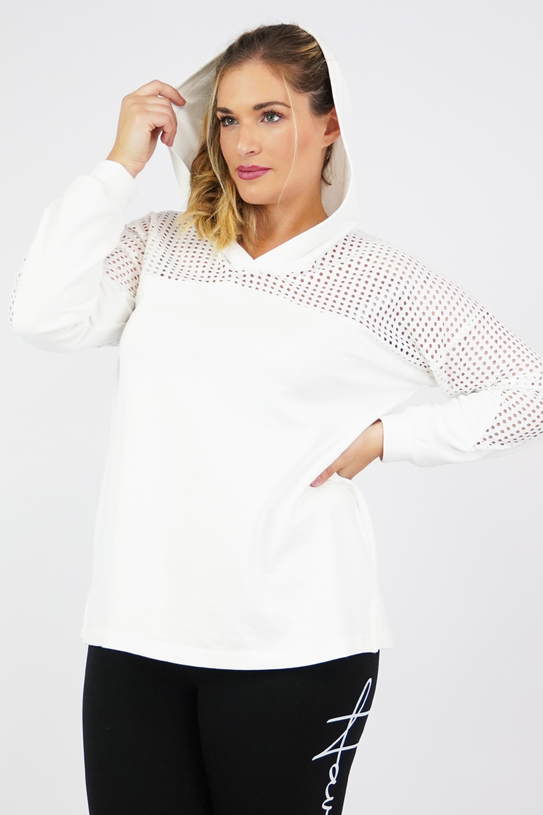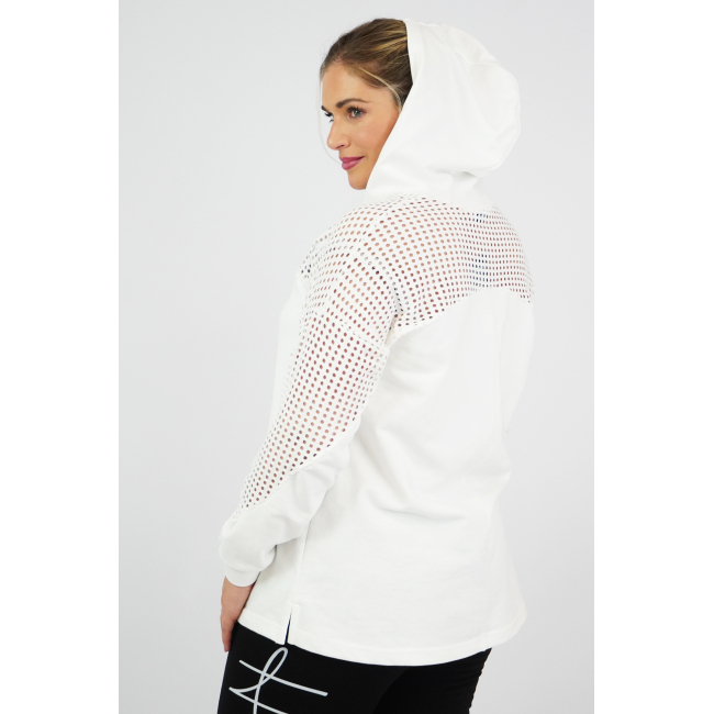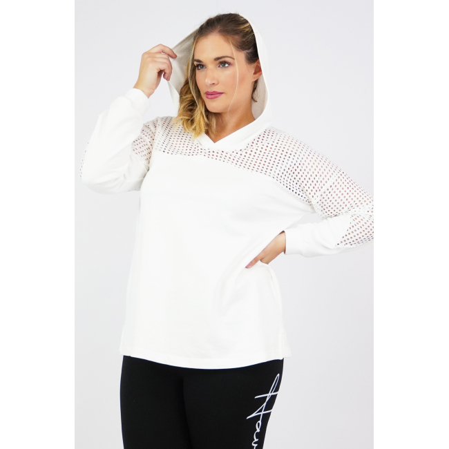 Μπλούζα baby φούτερ με κουκούλα, V ντεκολτέ, διακοσμητικό διάτρητο ύφασμα εμπρός/πίσω και στα μανίκια, σε Α πολύ άνετη γραμμή