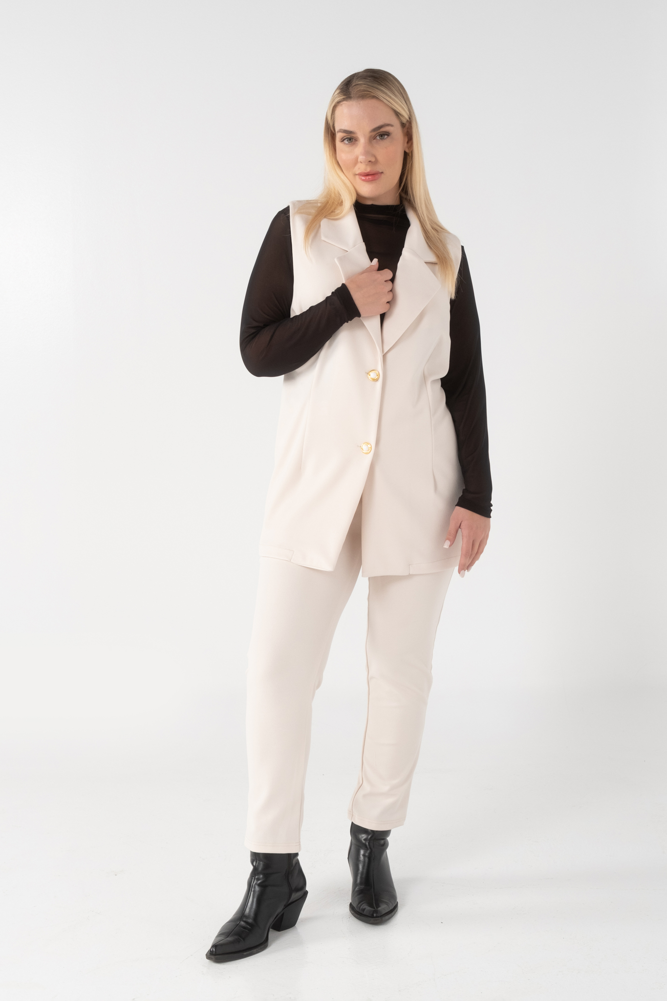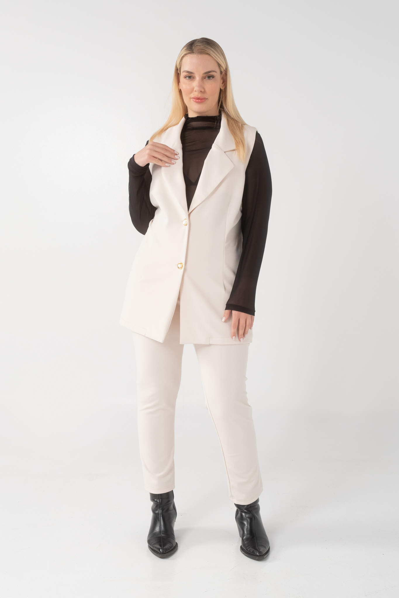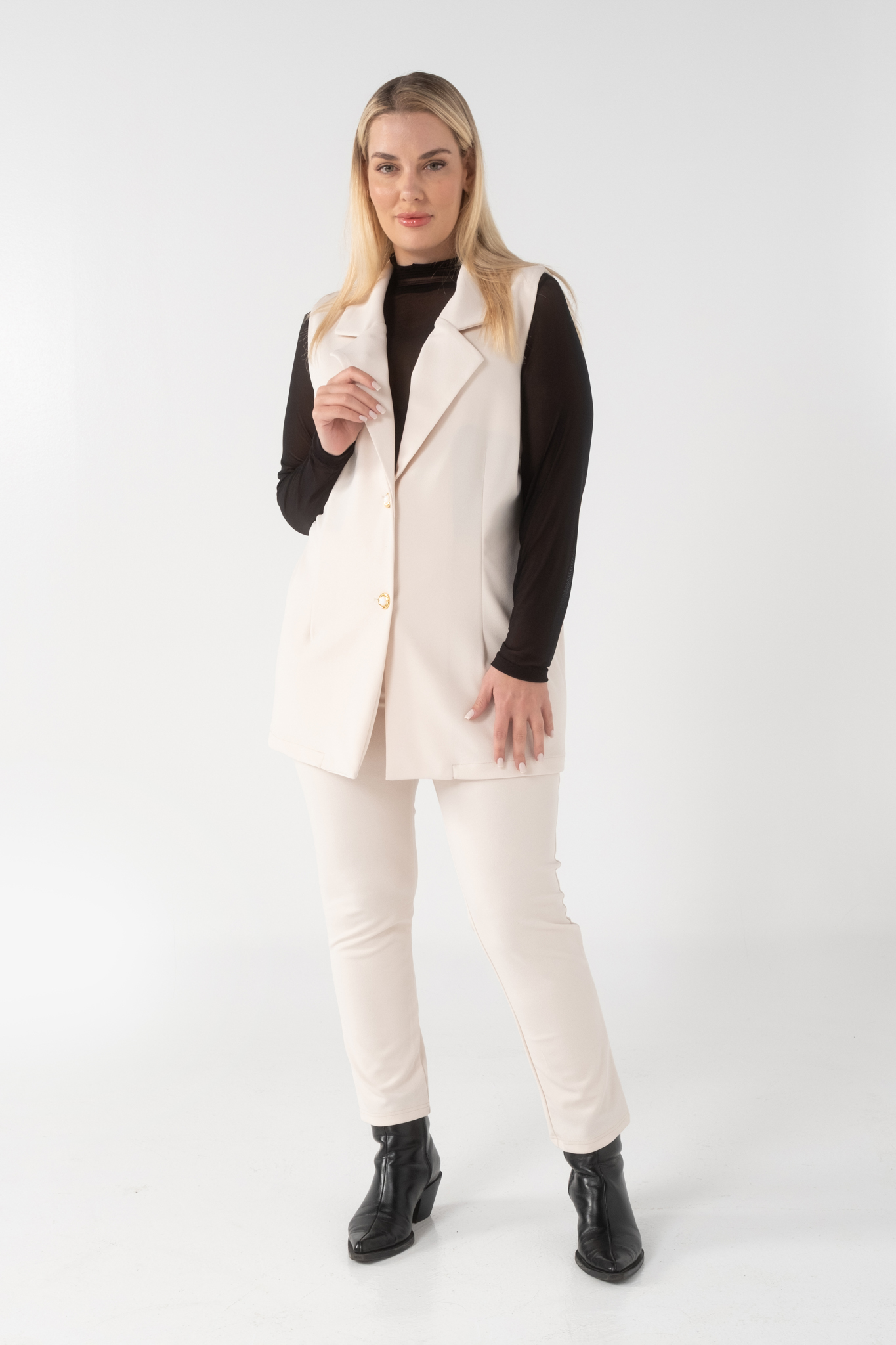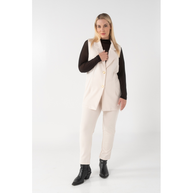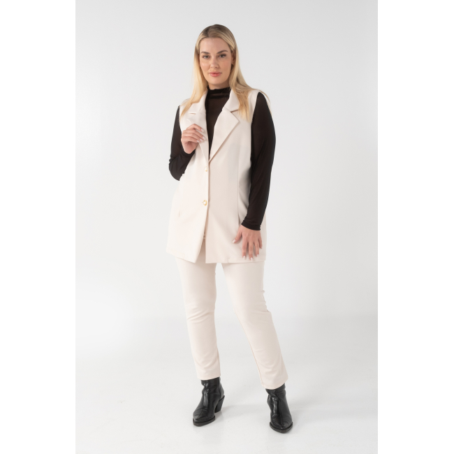 Γιλέκο σε scuba crep ελαστικό ύφασμα, με γραμμή που αναδυκνείει την σιλουέτα μας, πέτο γιακά και κουμπιά.