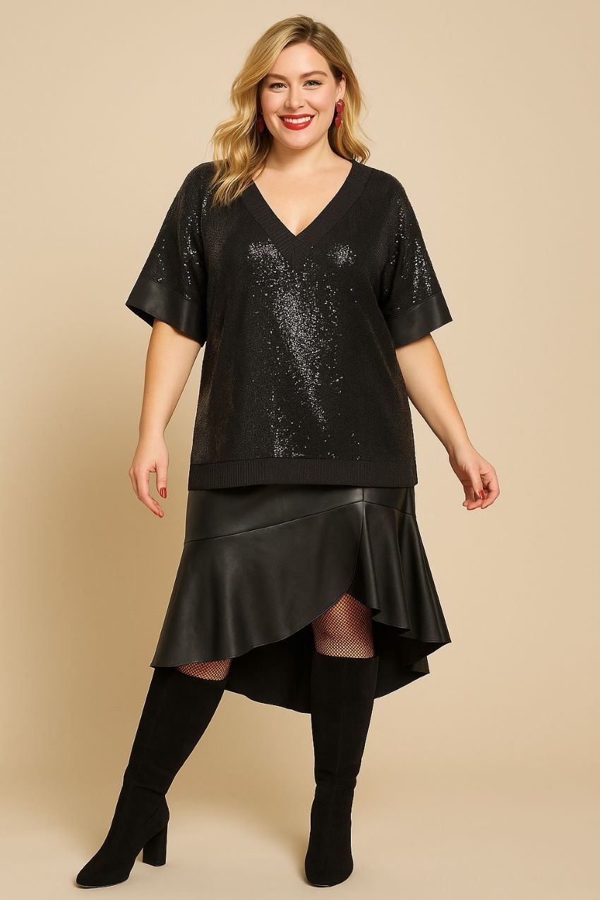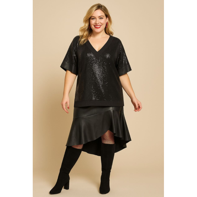 Φούστα μίντι με ασύμμετρο υπέροχο βολάν σε Artificial Leather (ελαστική δερματίνη), ζωνάκι με λάστιχο στα πλαΪνά και φερμουάρ πίσω. Πολύ άνετη ελαστική γραμμή