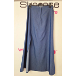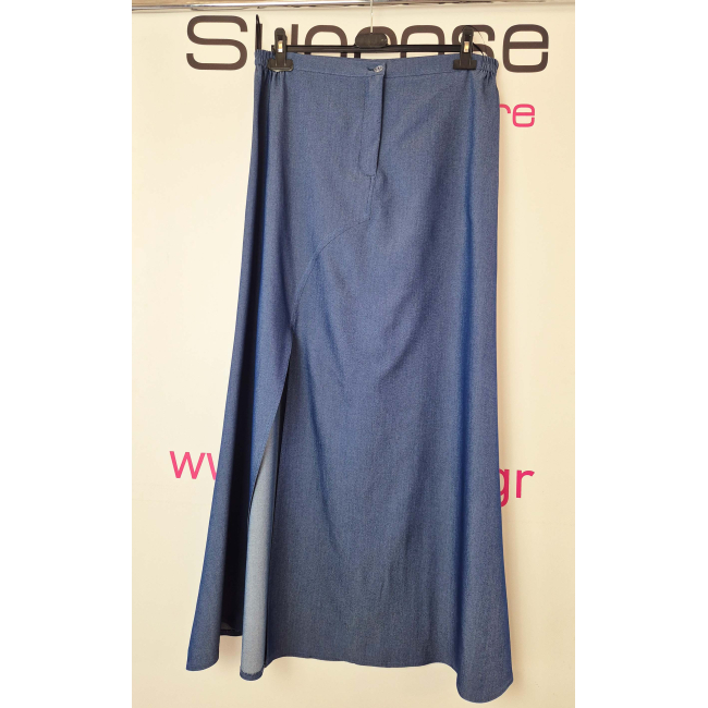 Eλαστική μάξι Φούστα, σε βαμβακερό ύφασμα (τύπου Jean), ζωνάκι 2εκ με λάστιχο πίσω για καλύτερη εφαρμογή, κουμπί, φερμουάρ και σκίσιμο στην δεξιά πλευρά της. Σε Α πολύ άνετη γραμμή που κολακεύει το σώμα μας.