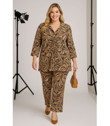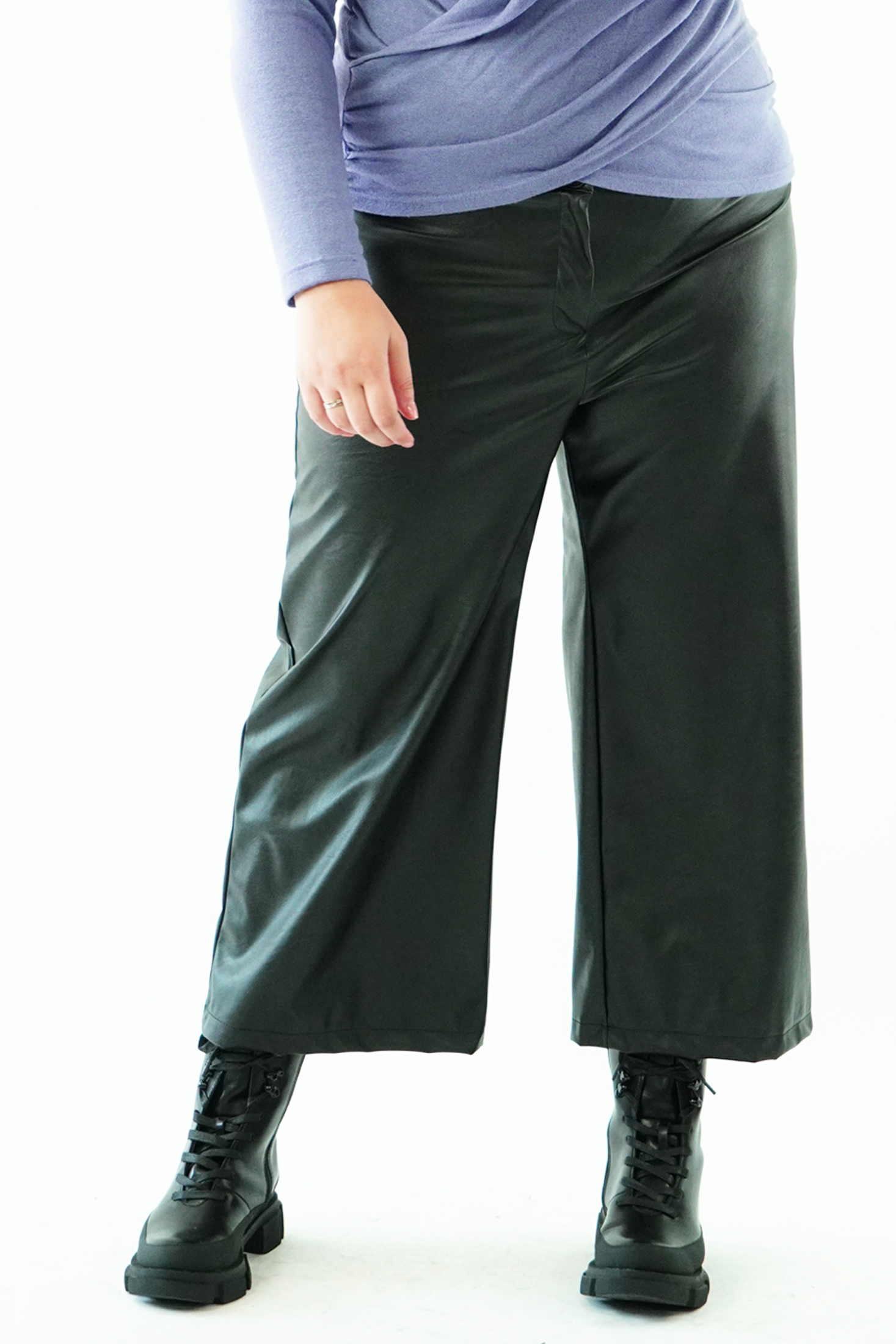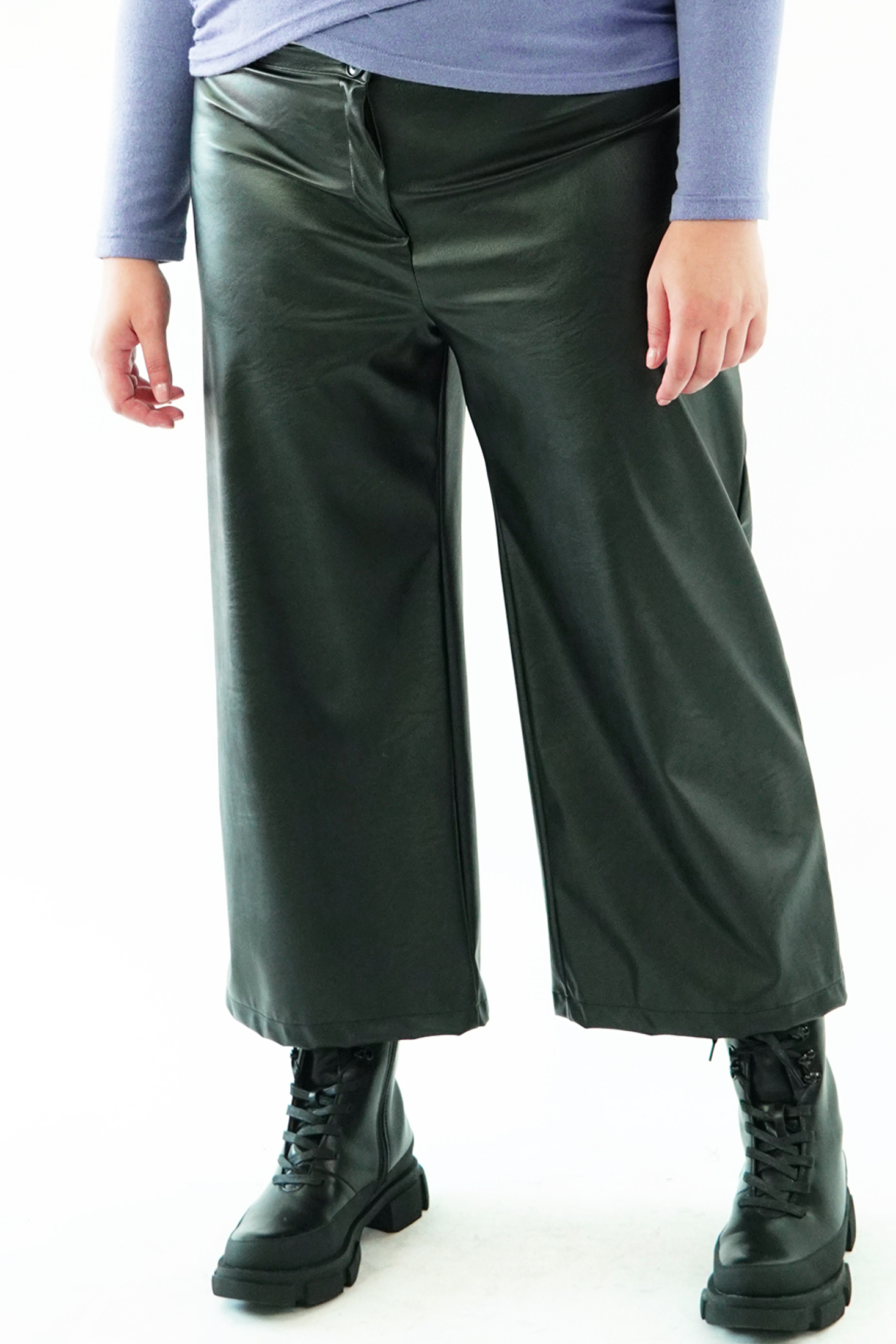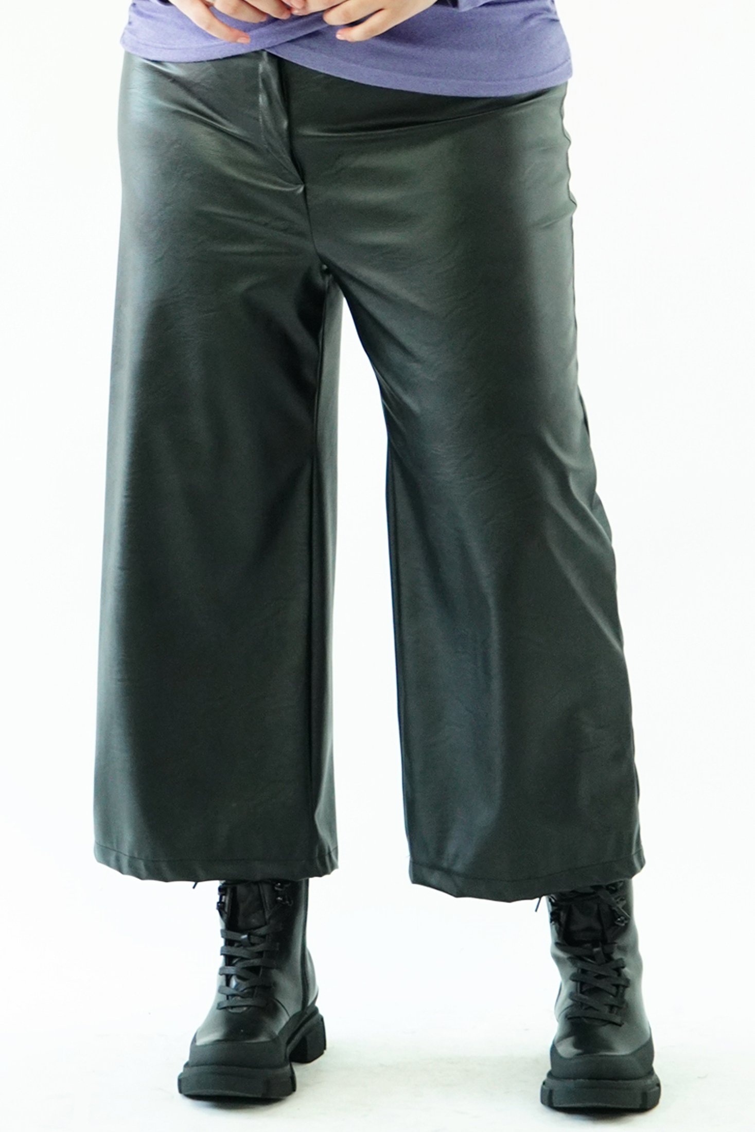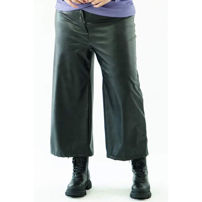 Παντελόνι σε οικολογική ελαστική δερματίνη, ψαράδικο, ζωνάκι με ενσωματωμένο λάστιχο πίσω, κουμπί, φερμουάρ, σε baggy γραμμή