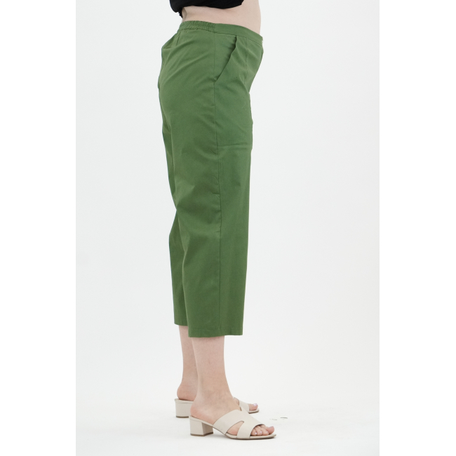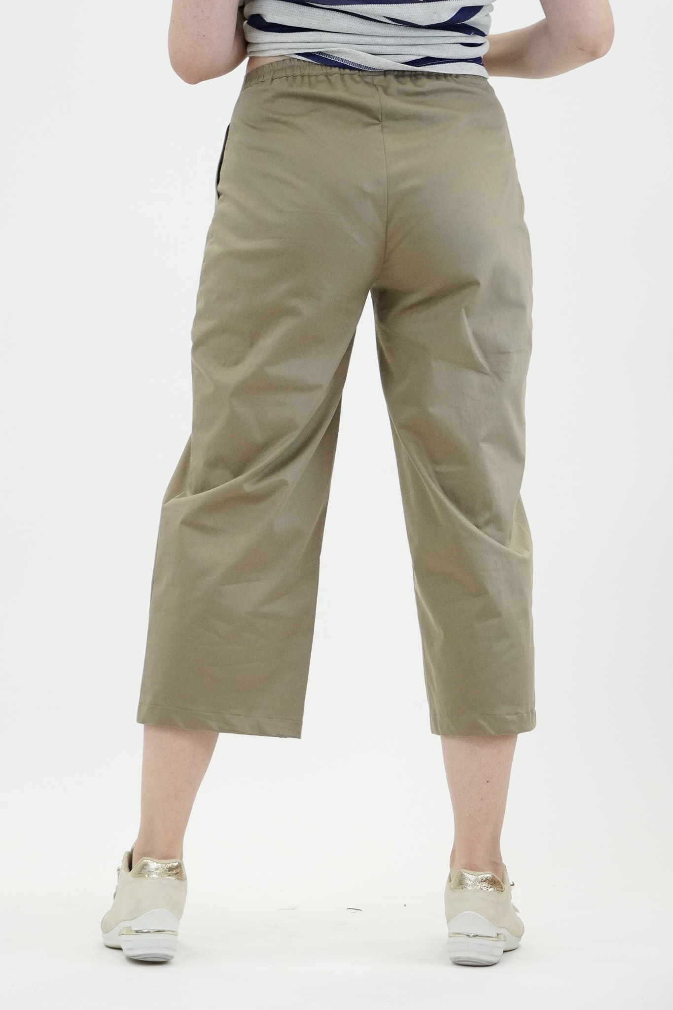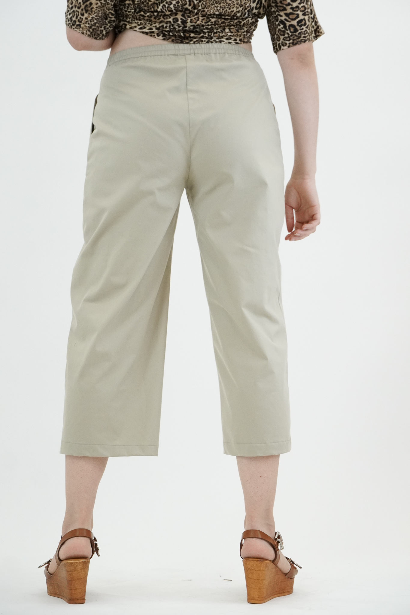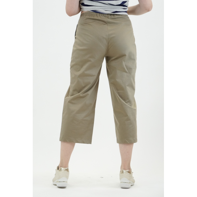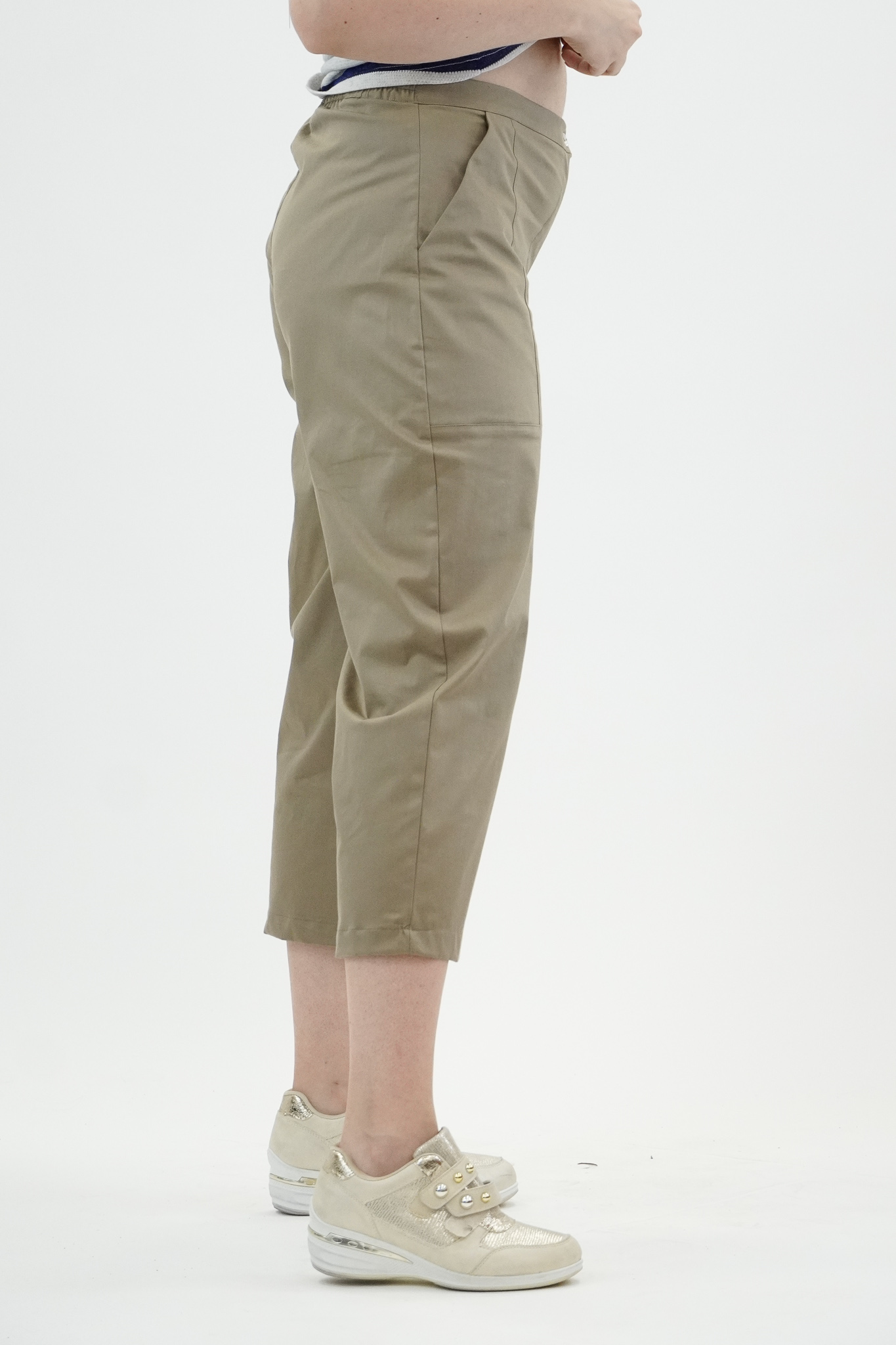 Παντελόνι αστραγάλου σε loose άνετη γραμμή, βαμβακερό ελαστικό ύφασμα, ζωνάκι με λάστιχο στο πίσω μέρος, κουμπί, φερμουάρ, φιλέτο τσέπες στα πλαϊνά. (85% cotton & 15% elastan)