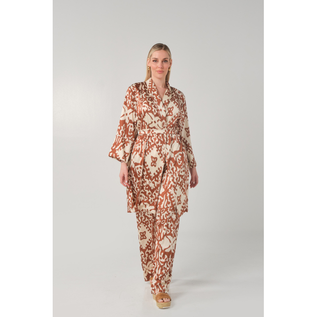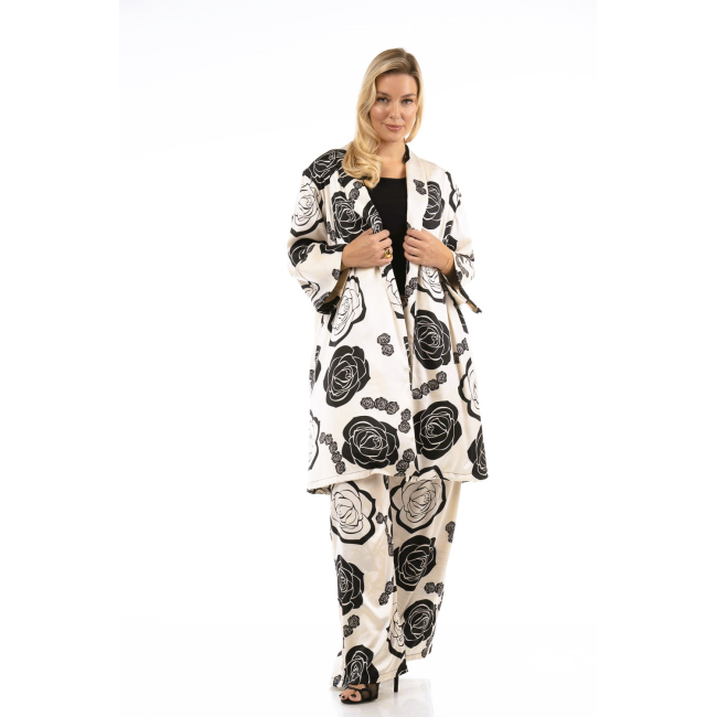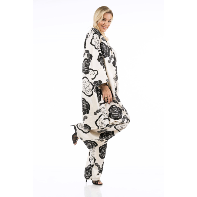 Ζακέτα σε voual σατεν ύφασμα, σε loose γραμμή, πέτο γιακά, ζώνη του ίδιου υφάσματος για προαιρετικό δέσιμο, σε ίσια πολύ άνετη γραμμή
