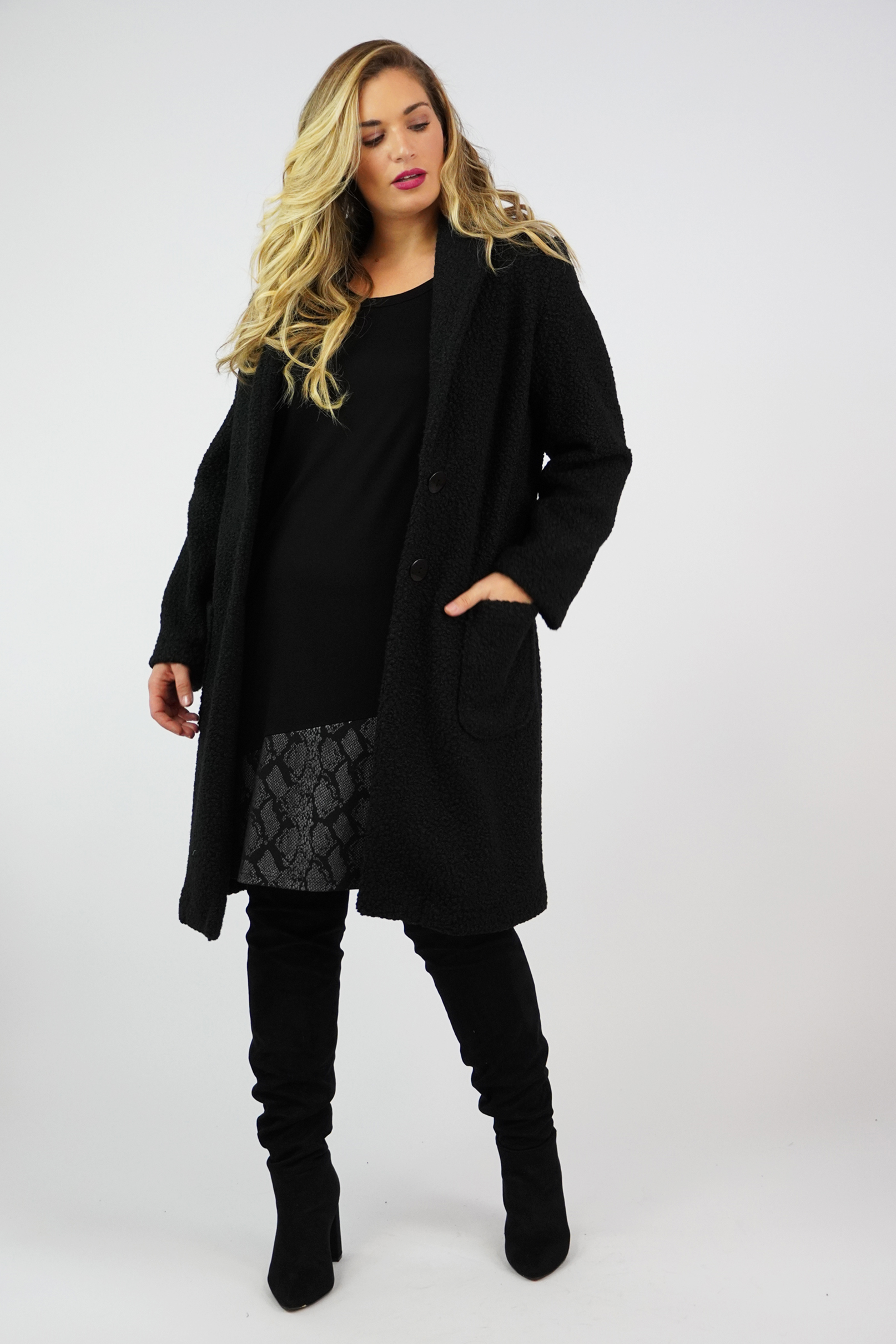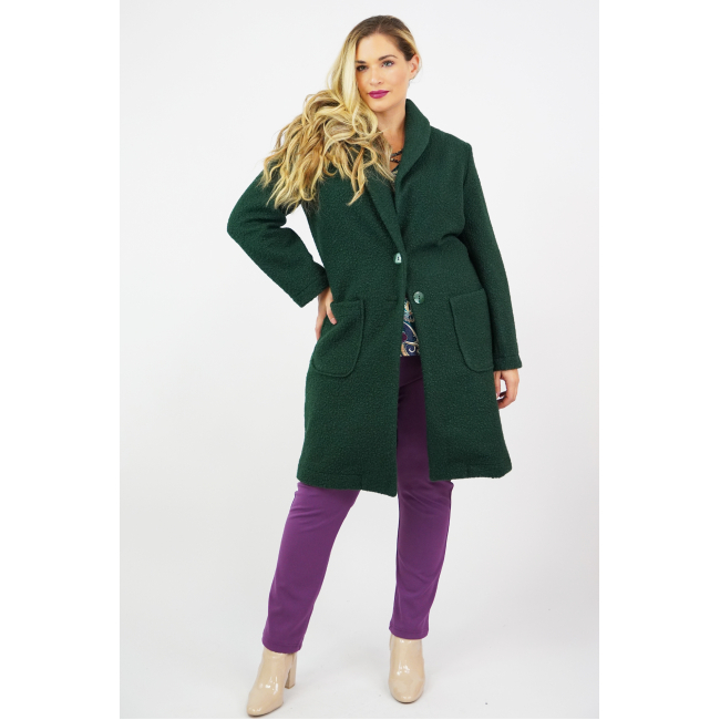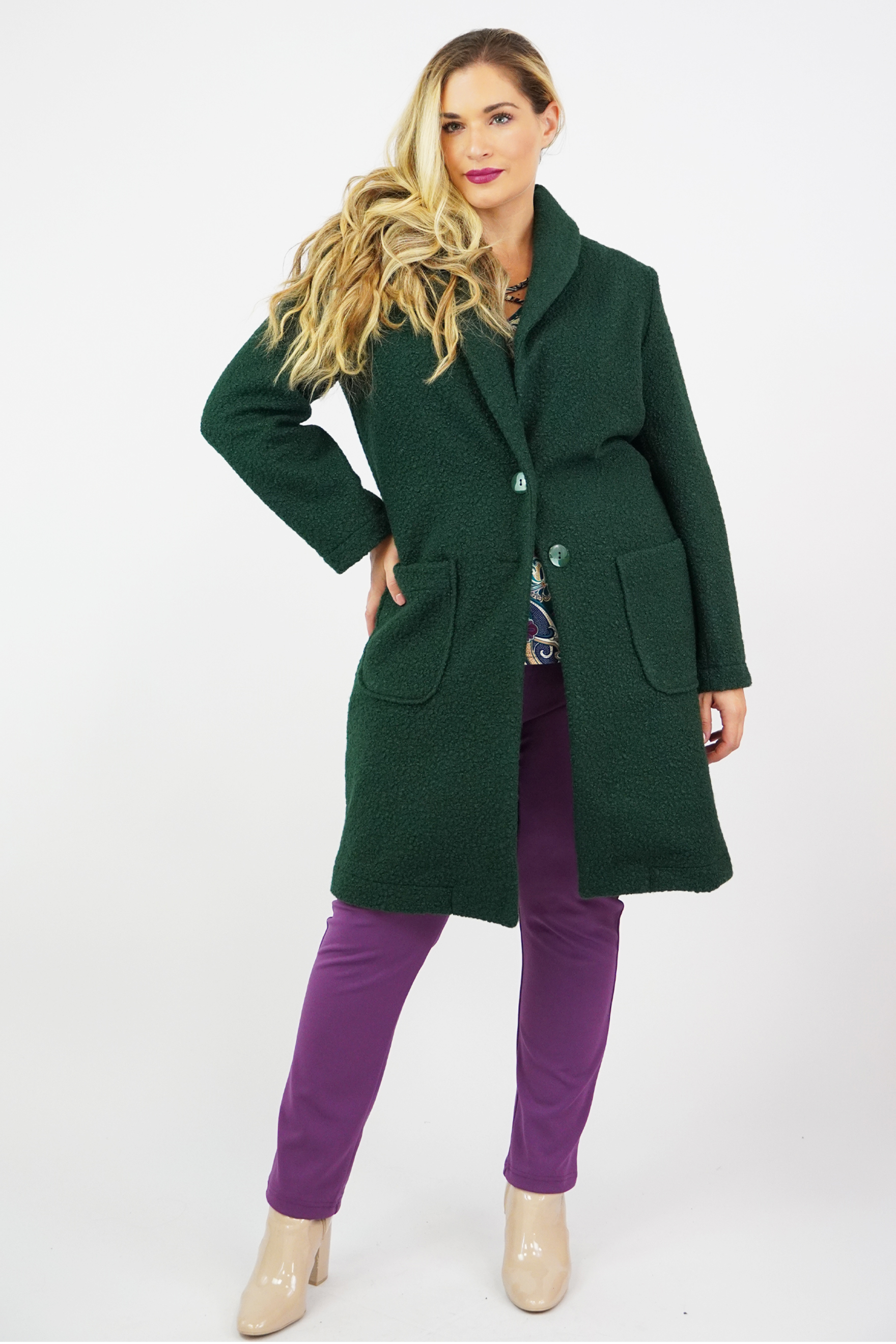 Παλτό Μπουκλέ, σμόκιν γιακά, μικρές διακριτικές βάτες, εξωτερικές τσέπες, σε ίσια πολύ άνετη γραμμή και υπέροχη εφαρμογή