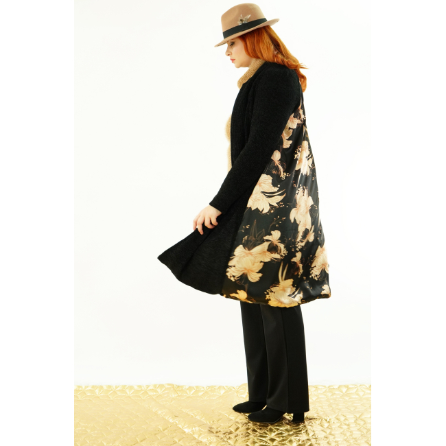 Ζακέτα μακριά (Bomber), Cenil πλεκτό ύφασμα μπροστά και στα μανίκια και voual satin εμπριμέ Flower πίσω, διαχωριζόμενo φερμουάρ, Μάο γιακά, φιλέτο εσωτερικές τσέπες, σε πολύ άνετη γραμμή.