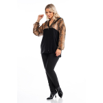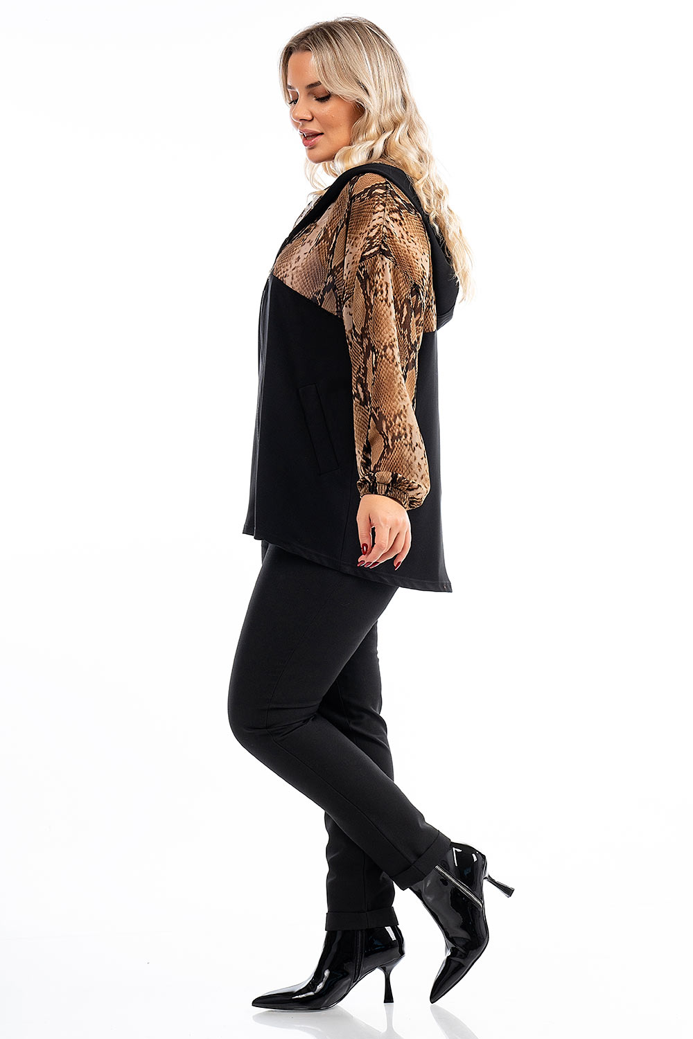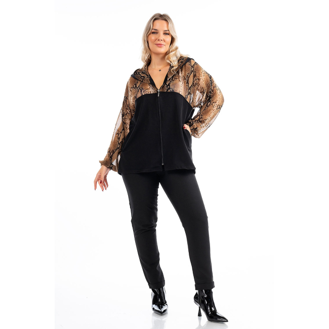 Εντυπωσιακή Ζακέτα/Bomber, μουσελίνα (animal print) στο πάνω μέρος, στα μανίκια και στο εσωτερικό της κουκούλας ή voual satin (γεωμετρικά σχήματα) και TR ύφασμα το σώμα. Κουκούλα, διαχωριζόμενο φερμουάρ, εσωτερικές φιλέτο τσέπες μπροστά, μανίκια με λάστιχο στο τελείωμά τους, σε ίσια πολύ άνετη γραμμή