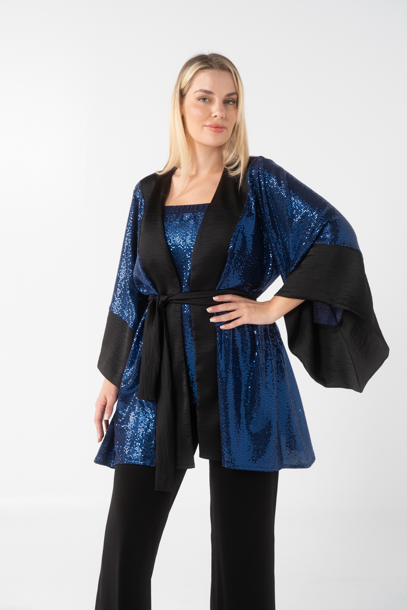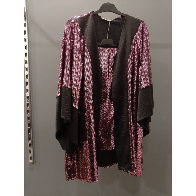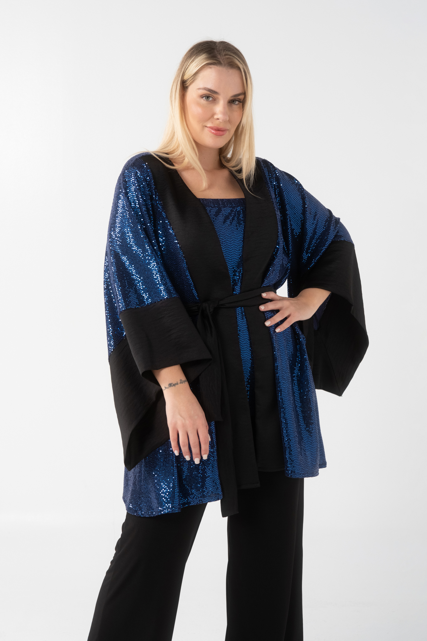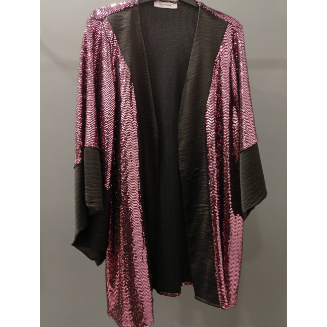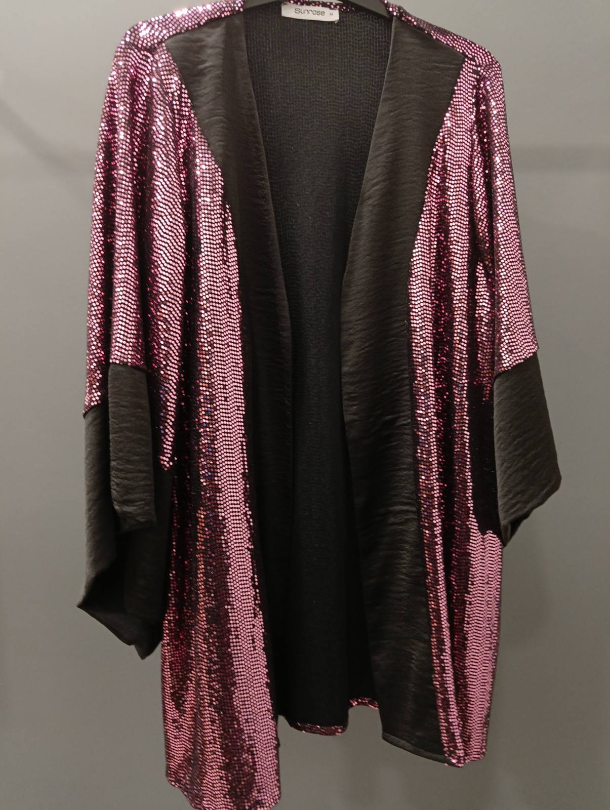 Τουνίκ/Ζακέτα σε Sequins Disco ύφασμα, Κομψή Ζακέτα σε ίσια πολύ άνετη γραμμή, με φάσα μαύρη ζορζέτα σε γιακά και μανίκια, άνισα μανίκια και ζώνη για προαιρετικό δέσιμό είτε ως κρουαζέ ή ως ίσιο.