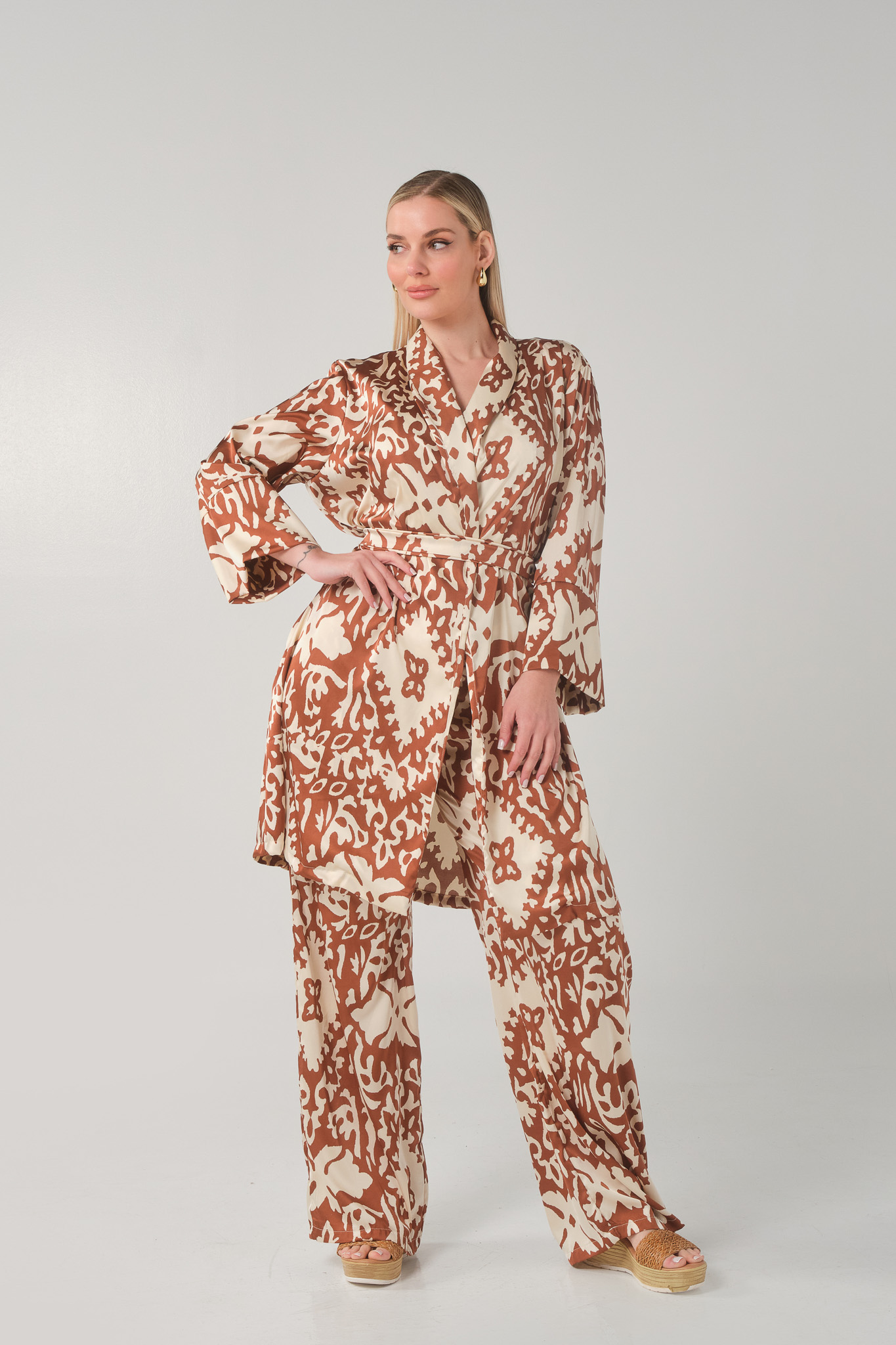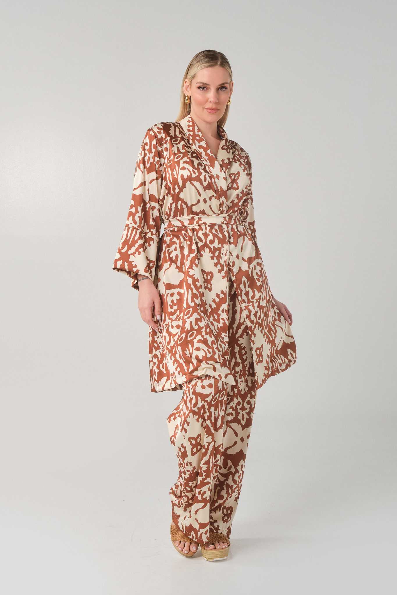Ζακέτα σε voual σατεν ύφασμα, σε loose γραμμή, πέτο γιακά, ζώνη του ίδιου υφάσματος για προαιρετικό δέσιμο, σε ίσια πολύ άνετη γραμμή