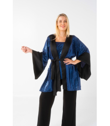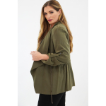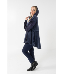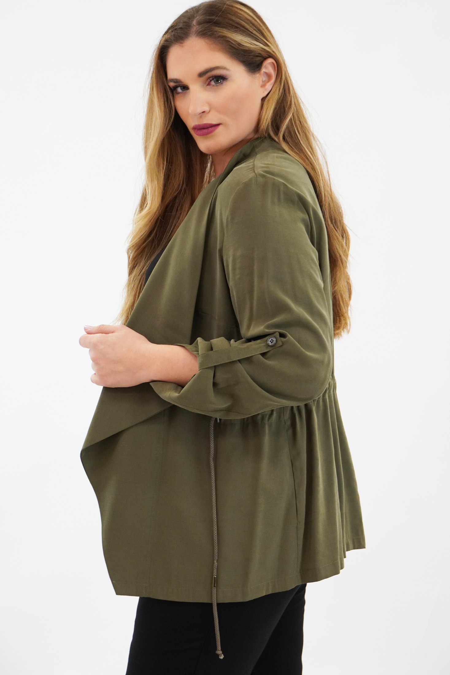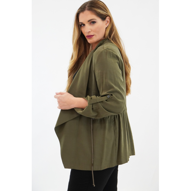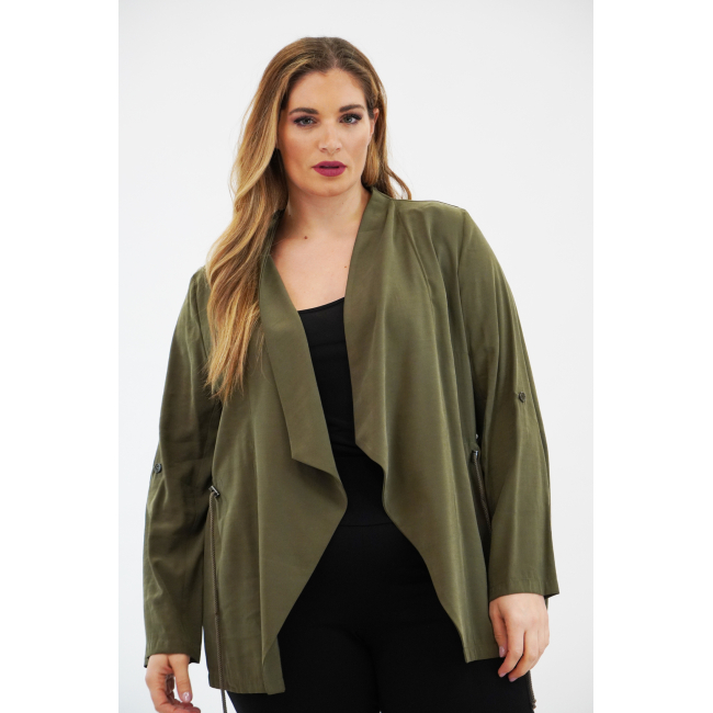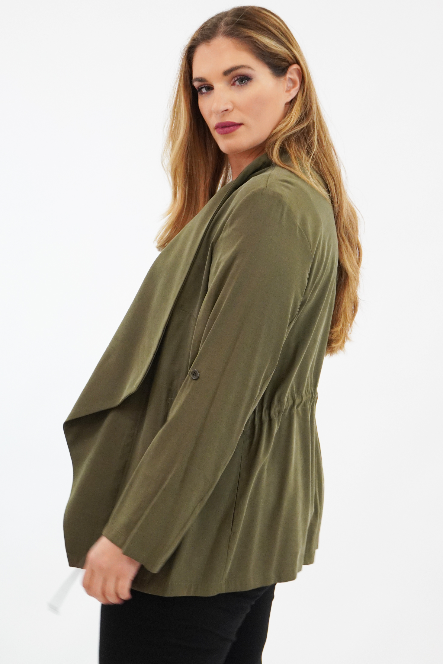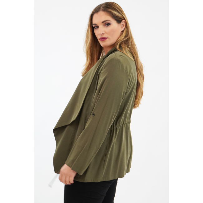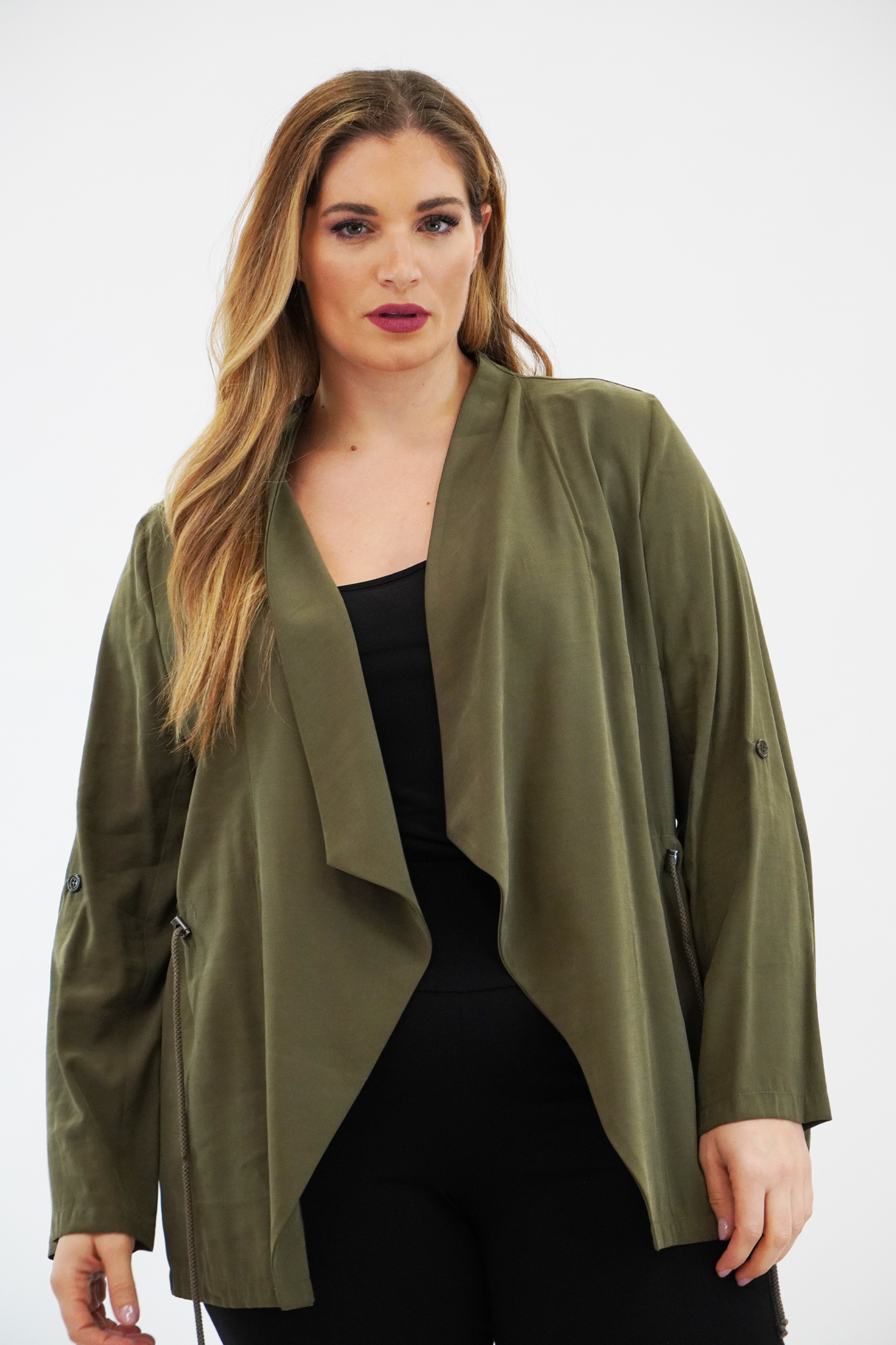 Ζακέτα σε κούπρο ύφασμα τύπου σουέτ, σμόκιν ασύμετρο γιακά, εσωτερικό κορδόνι στη μέση για καλύτερη εφαρμογή και αναδιπλώμενα μανίκια, σε πολύ άνετη γραμμή