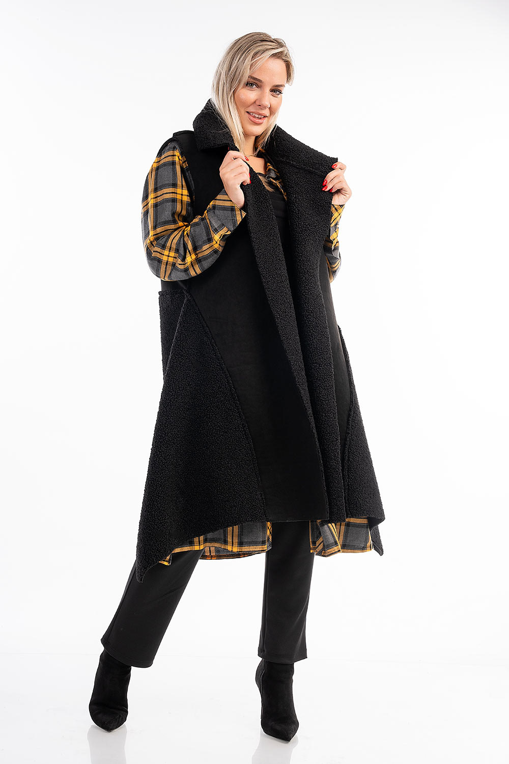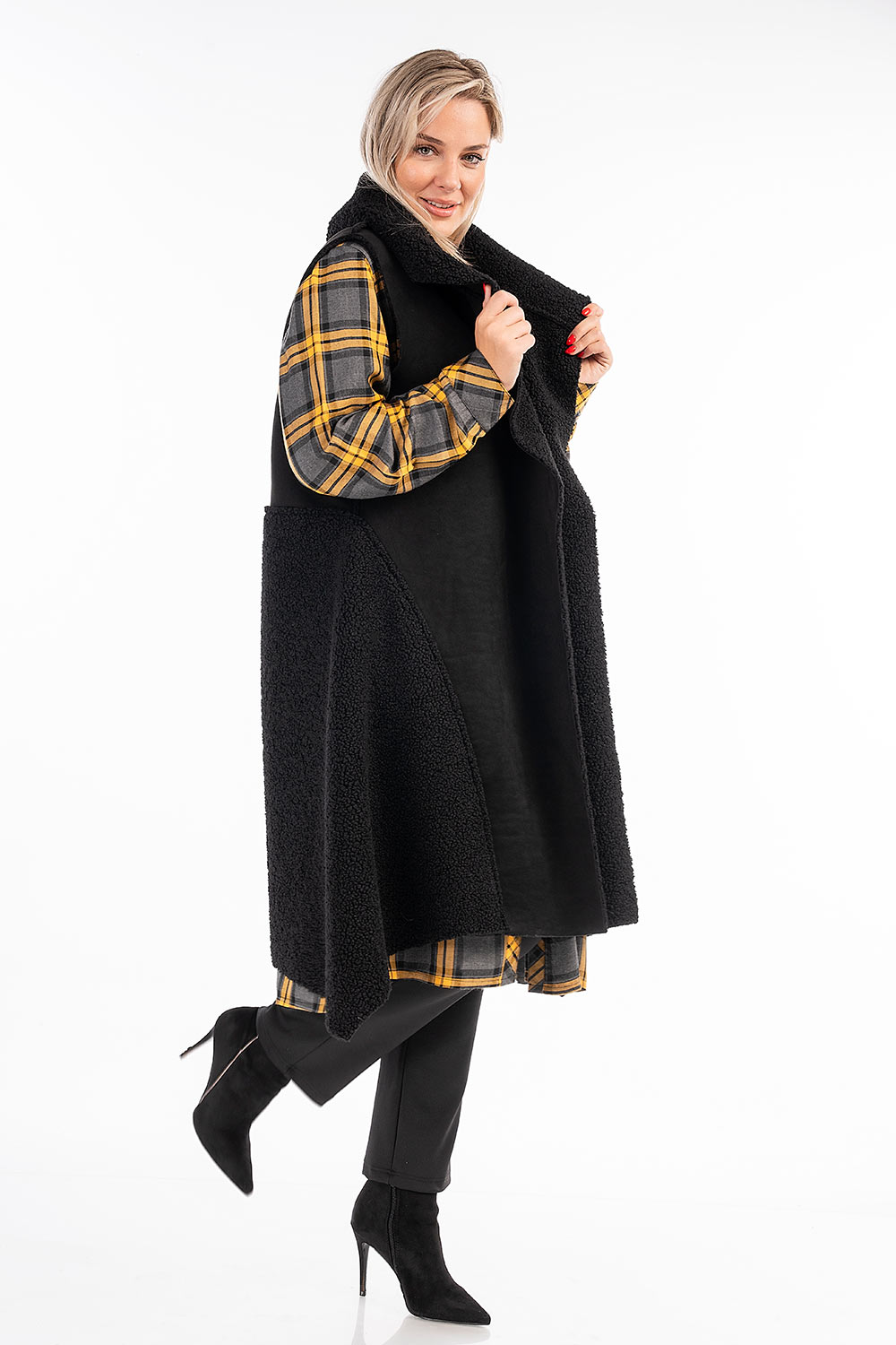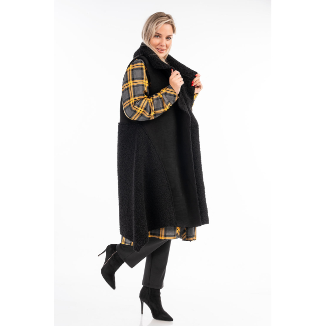 Αμάνικο Παλτό/Γιλέκο σε Σουέτ ύφασμα με ενσωματωμένη γούνα, πολύ ζεστό και απίστευτα χουχουλιάρικο. Μεγάλο σμόκιν γιακά και πολύ άνετη Α γραμμή στο σώμα.