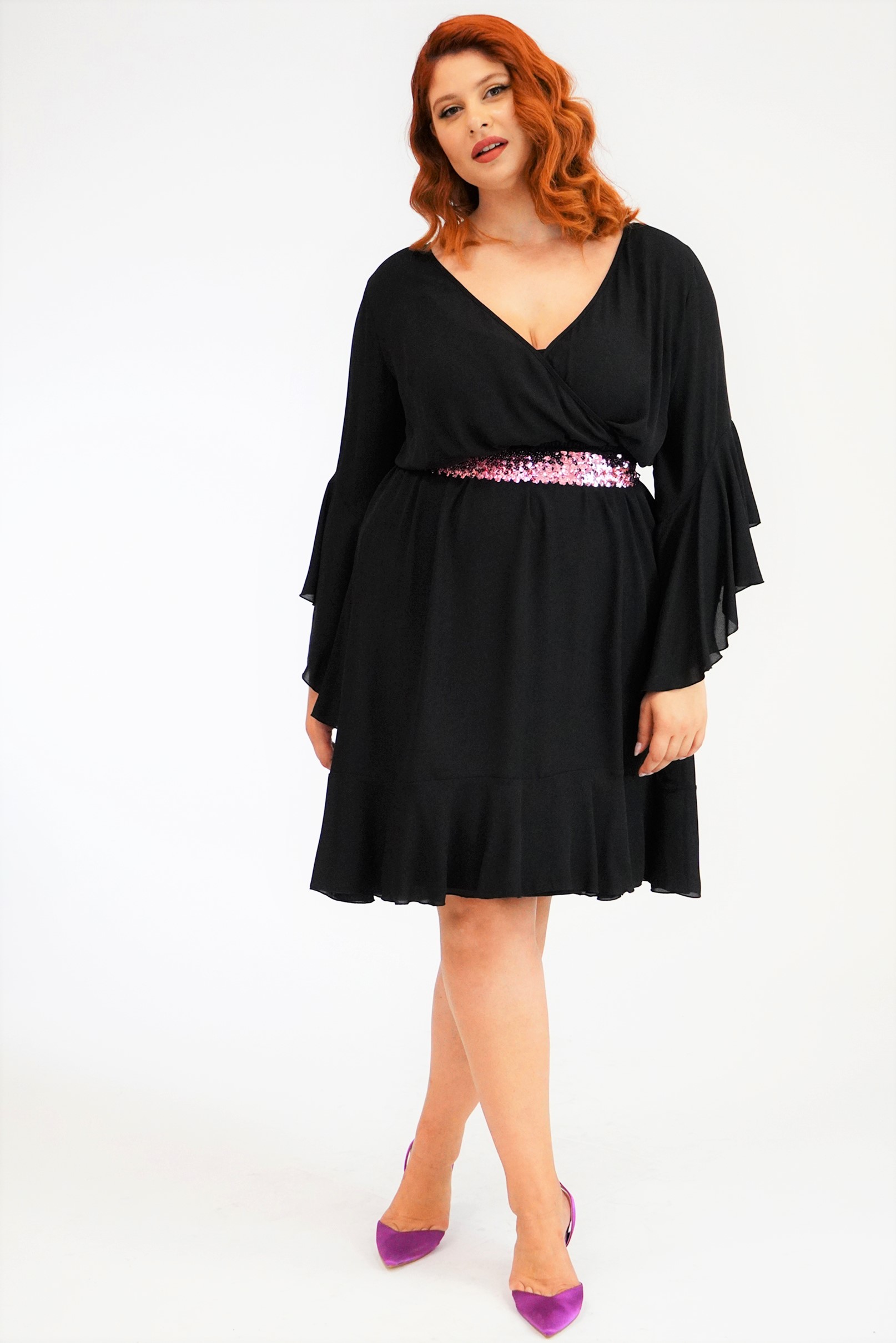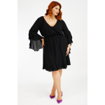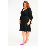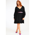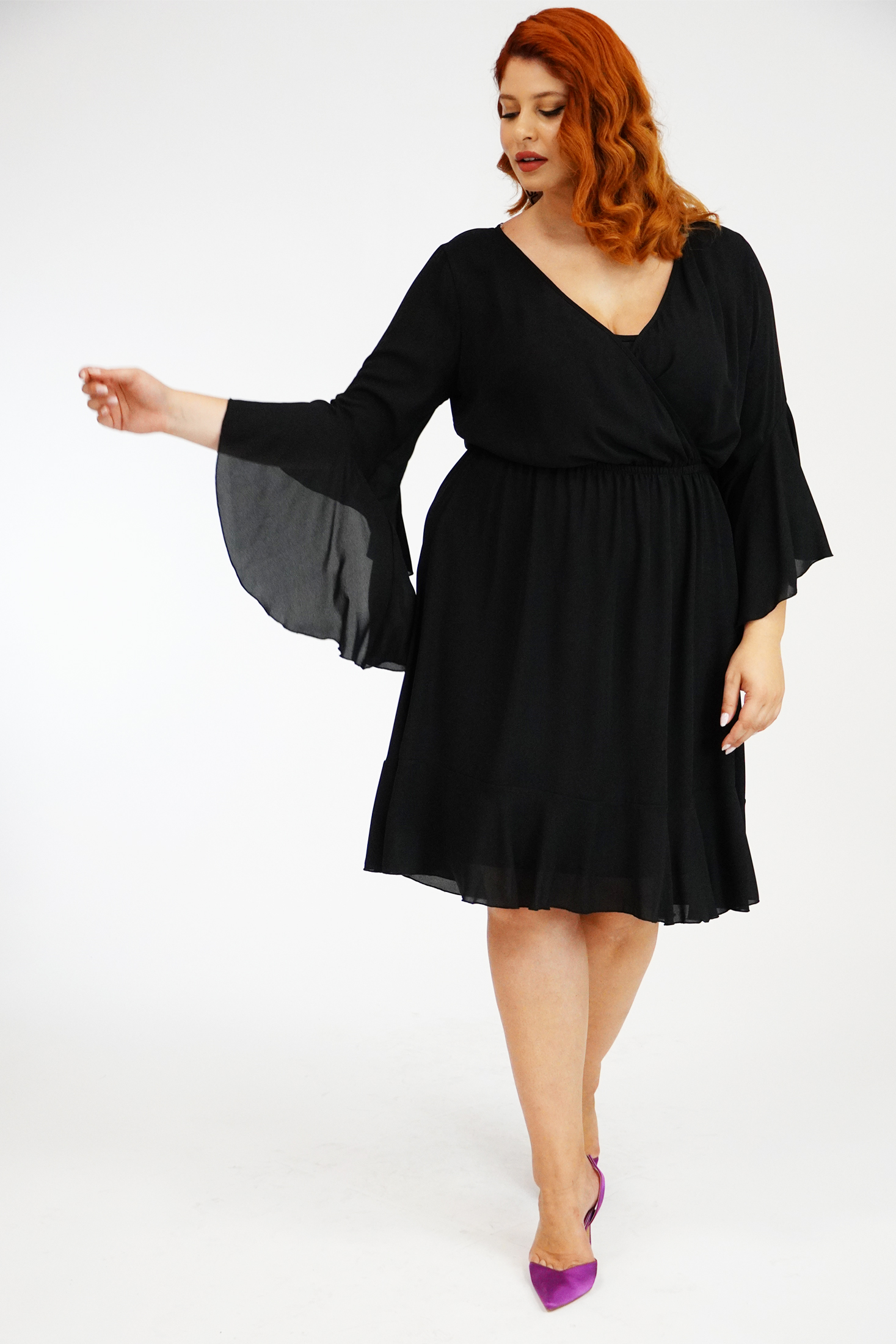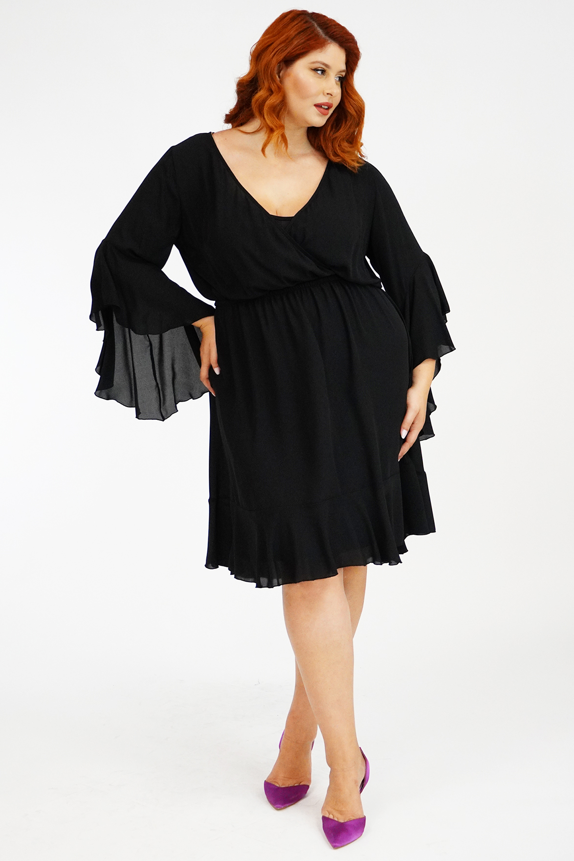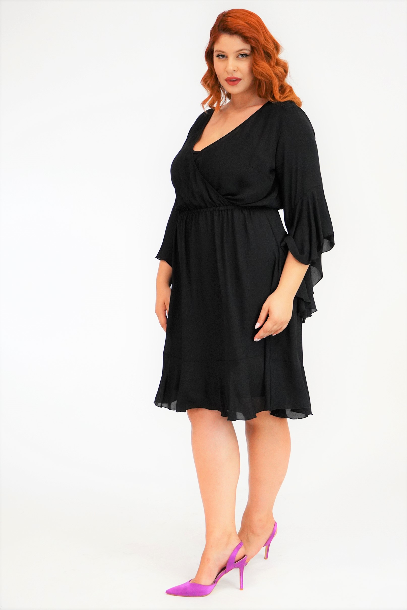 Φόρεμα αέρινο σε αδιάφανη zorzette, midi, κρουαζέ, ελαφρύ λάστιχο στη μέση, άνισα φαρδιά μανίκια με βολάν ασύμετρο στο τελείωμά τους, σε πολύ άνετη γραμμή